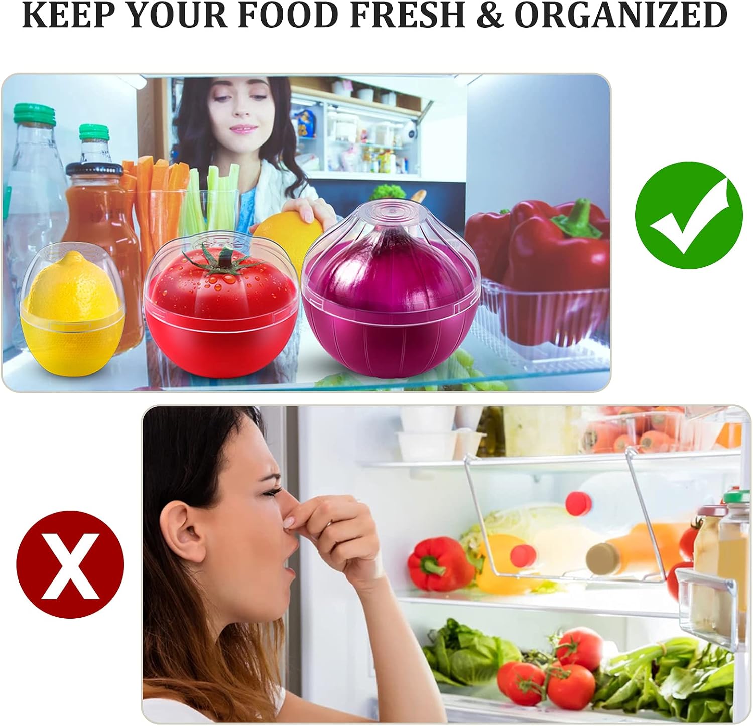 Vegetable and Fruit Storage Containers for Fridge, 3 Pieces BPA Free Reusable Food Saver - Tomato, Lemon, Onion Keeper Holder - Refrigerator Vegetable Crisper for Keeping Food Fresh Longer