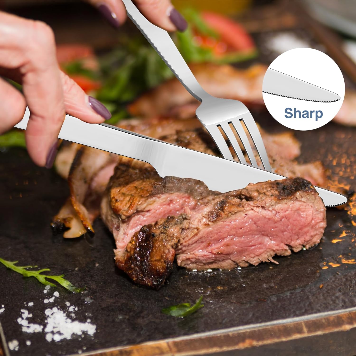 - QUALITY STAINLESS STEEL: Our flatware sets are made up of stainless steel, which will not easy to bend, break, or get damaged by heat. Dishwasher Safe, sturdy and durable stainless steel silverware set, using vacuum plating technology that no need to worry about fading or cracking. It supports hand washing and dishwasher washing, which can save your precious time.