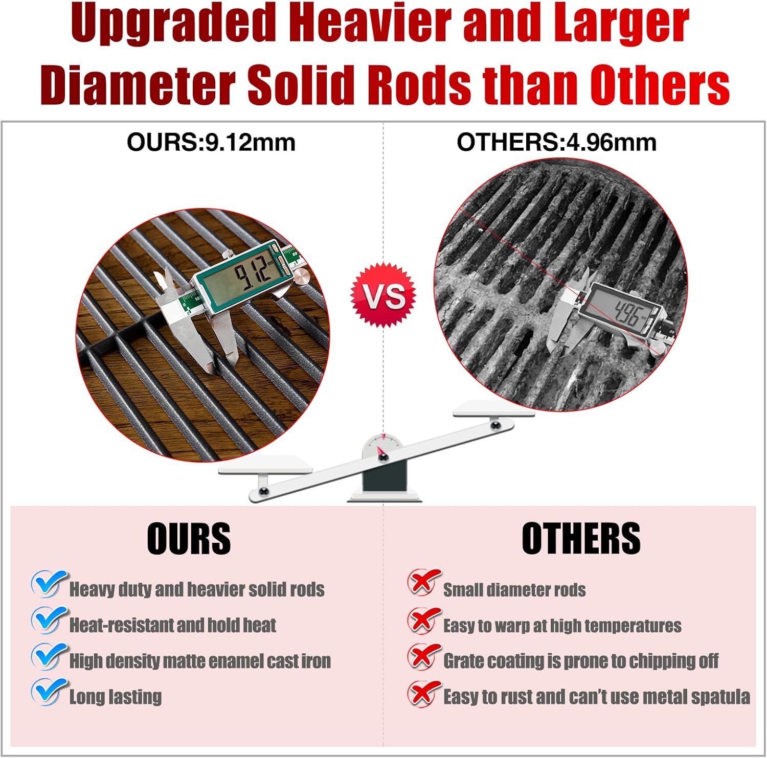 - 【UPGRADED HEAVIER, SMALLER CLEARANCE AND LARGER DIAMETER SOLID RODS】 You will get the dyna glo replacement parts grill grates that are made of matte enamel cast iron. dynaglo grates will last for many years if it's taken care of. 【HIGH HEAT RETENTION AND COOK FOOD FAST, DELIVERS EVEN HEAT DISTRIBUTION】 Heavy duty and more durable than others. retaining and transferring heat, perfect for searing and locking. 【Not like the porcelain coating grate that the coating chips or cracks over time】