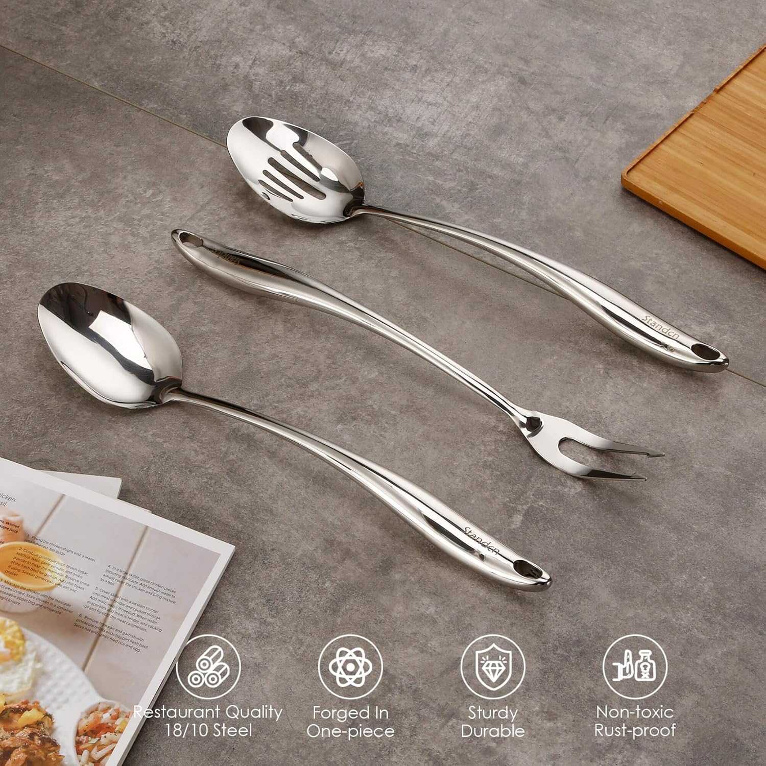- 9-Pieces, 1 meat fork, 1 solid serving spoon, 1 slotted serving spoon, 1 spatula, 1 skimmer spoon, 1 slotted spatula turner, 1 large spoon, 1 spaghetti spoon, 1 soup ladle. These premium utensils are safe to use for cooking any type of food, It is also a great gift for friends and family who love cooking with metal kitchen utensils, and be sure to be asked where you bought it