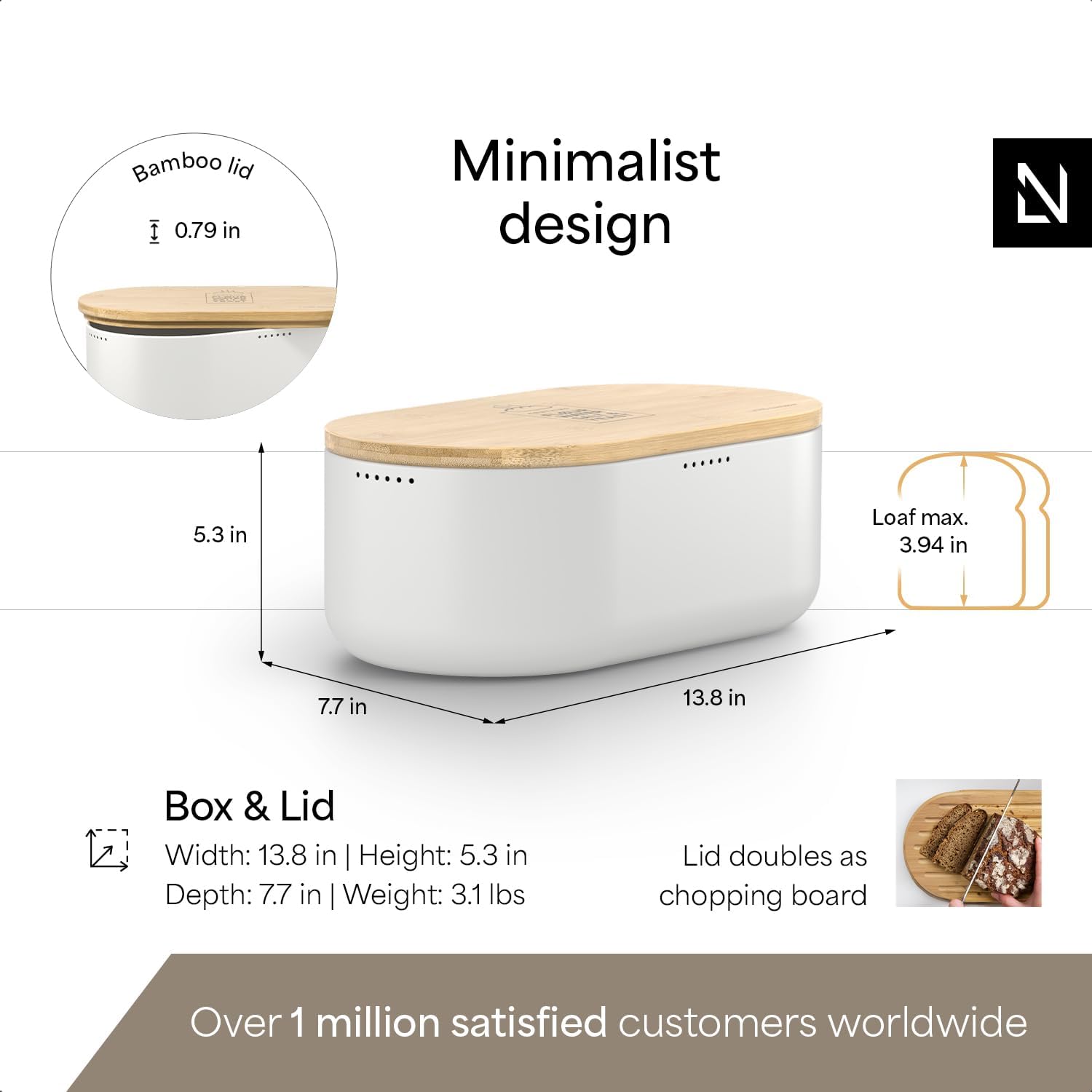 LARS NYSØM Bread Box I Metal Box with linen bag for long lasting freshness I Bread Bin with bamboo lid usable as cutting board I 14.2x7.5x5.1 In (Pure White)