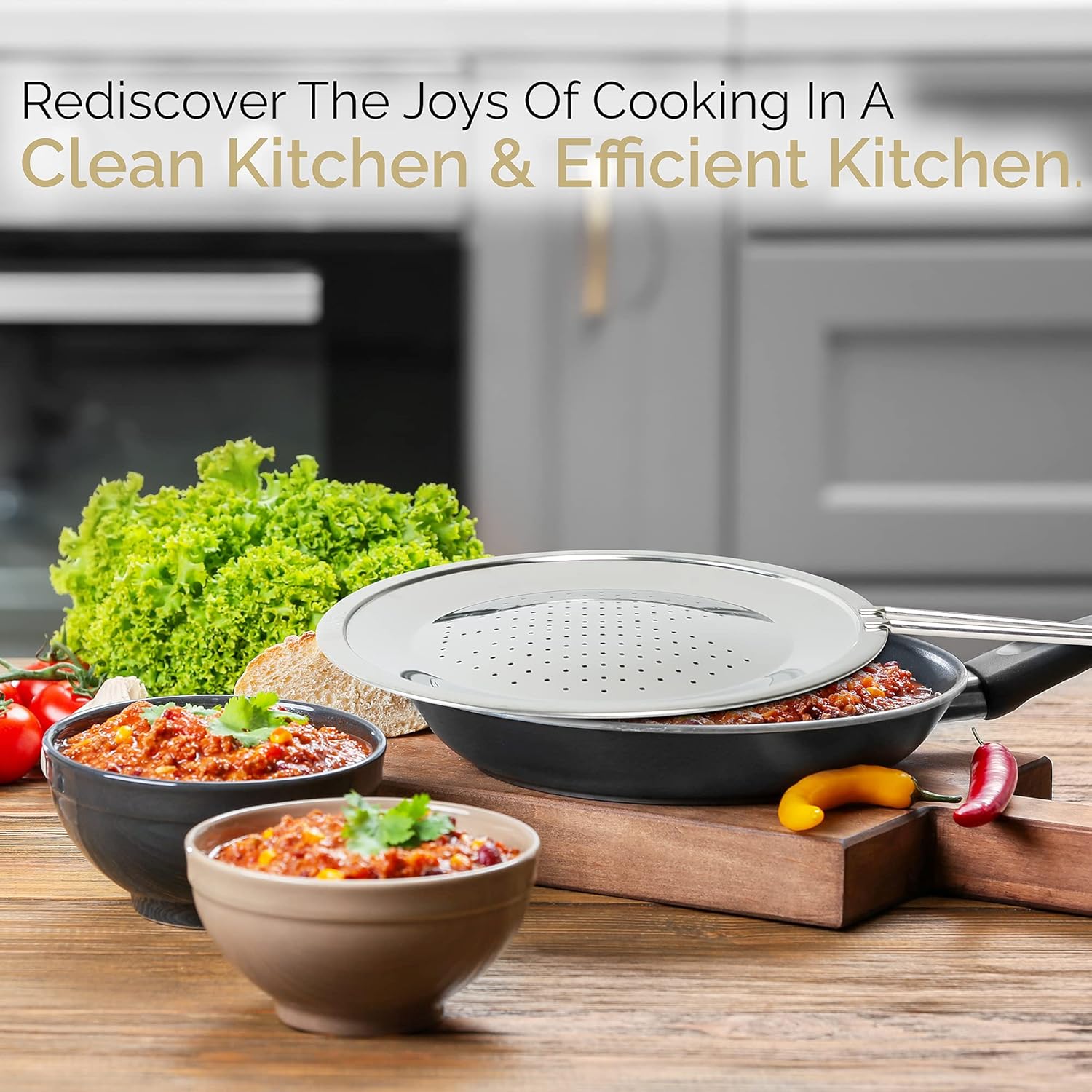 - MADE OF PERFORATED STAINLESS STEEL - This symmetrically structured perforated splatter screen releases water vapor. It enriches a crisp texture, characteristic fried flavors and aromas, a pleasure to your taste buds. You can increase your dish value and prepare your dishes like a professional chef. This is a must-have product for those who do not want a messy kitchen anymore and those who want to serve great food.