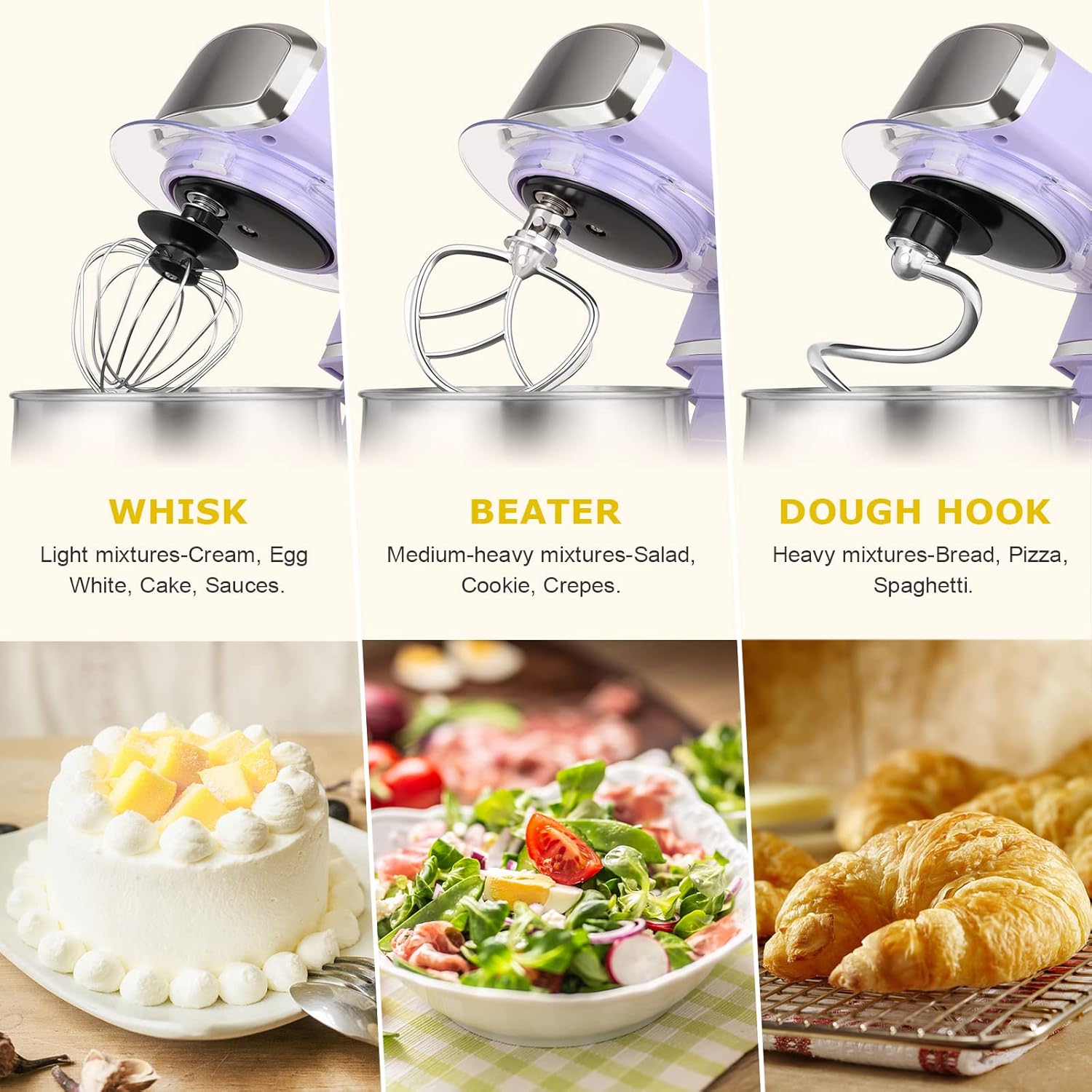 - 3.2Qt Capacity and Tilt Head Design - Our little kitchen mixer equipped with 3.2Qt stainless steel bowl,suitable for new baker,1-2 members family or couples,easy to operate and clean up.Tilt-head design mixer allows access to install or uninstall bowl and accessories easily.And transparent anti-splash lid could prevent the ingredient making a mess.