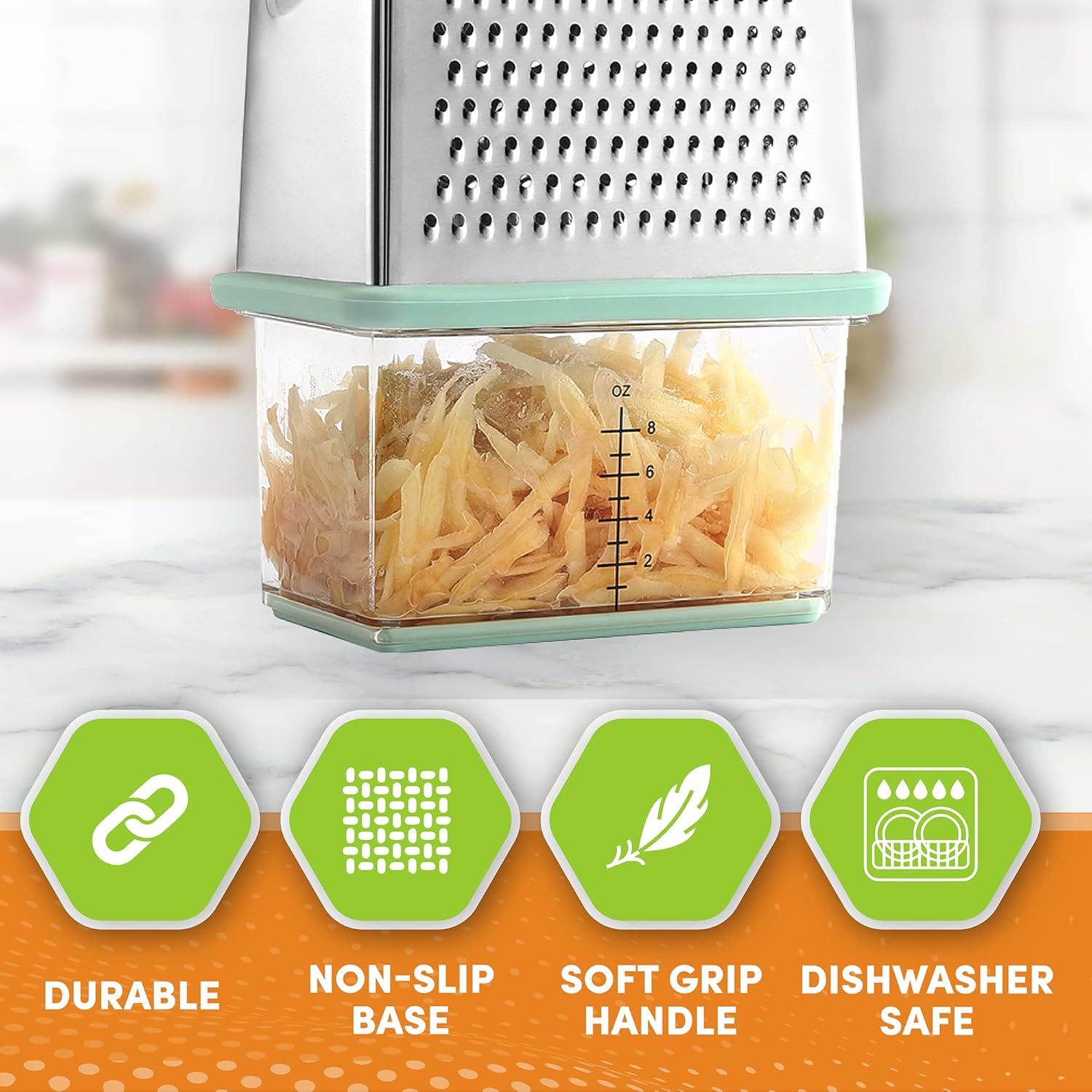 Spring Chef Professional 10" Parmesan Cheese Grater With Container, Stainless Steel & Soft Grip Handle, Handheld Kitchen Cheese Shredder, Box Grater with 4 Sides for Potato, Carrot, Veggie - Mint