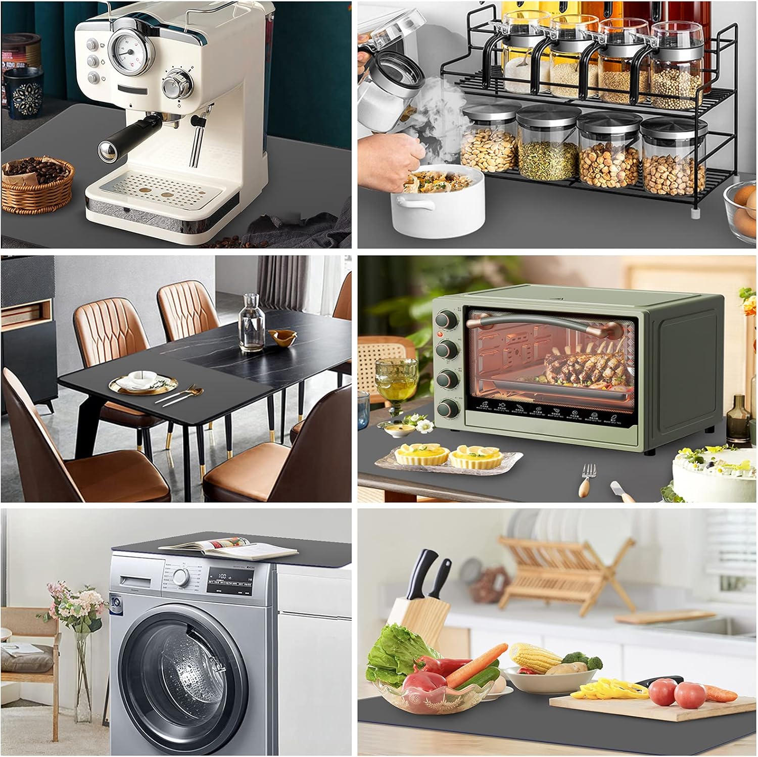 - You Canโt Go Wrong with It: This placemat can solve multiple problems. Great for catching messes. Protect counters from spills, scratches, grease, coffee stains, or damage. Place hot items of all sizes directly on the mat without having to dig through the drawer for a hot pad and no more need for trivets. Reduce the noises made by appliances. No need to worry about items slipping off the countertop. Tools will keep in place. Even if you are rolling dough hard on it, the mat won't slide