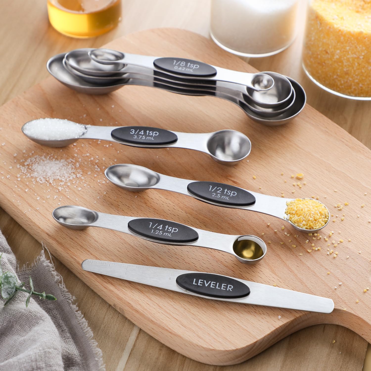 - 【DOUBLE SIDED MEASURING SPOONS 】-The measuring spoons double ended design makes it compatible for measuring the dry and liquid Ingredients,round end measuring liquid ingredient , narrow oval end can fit in most spice jars or bottles. Measuring spoons flat on the bottom and they don't spill. With the included leveler you can measure the exact amount for your recipes.