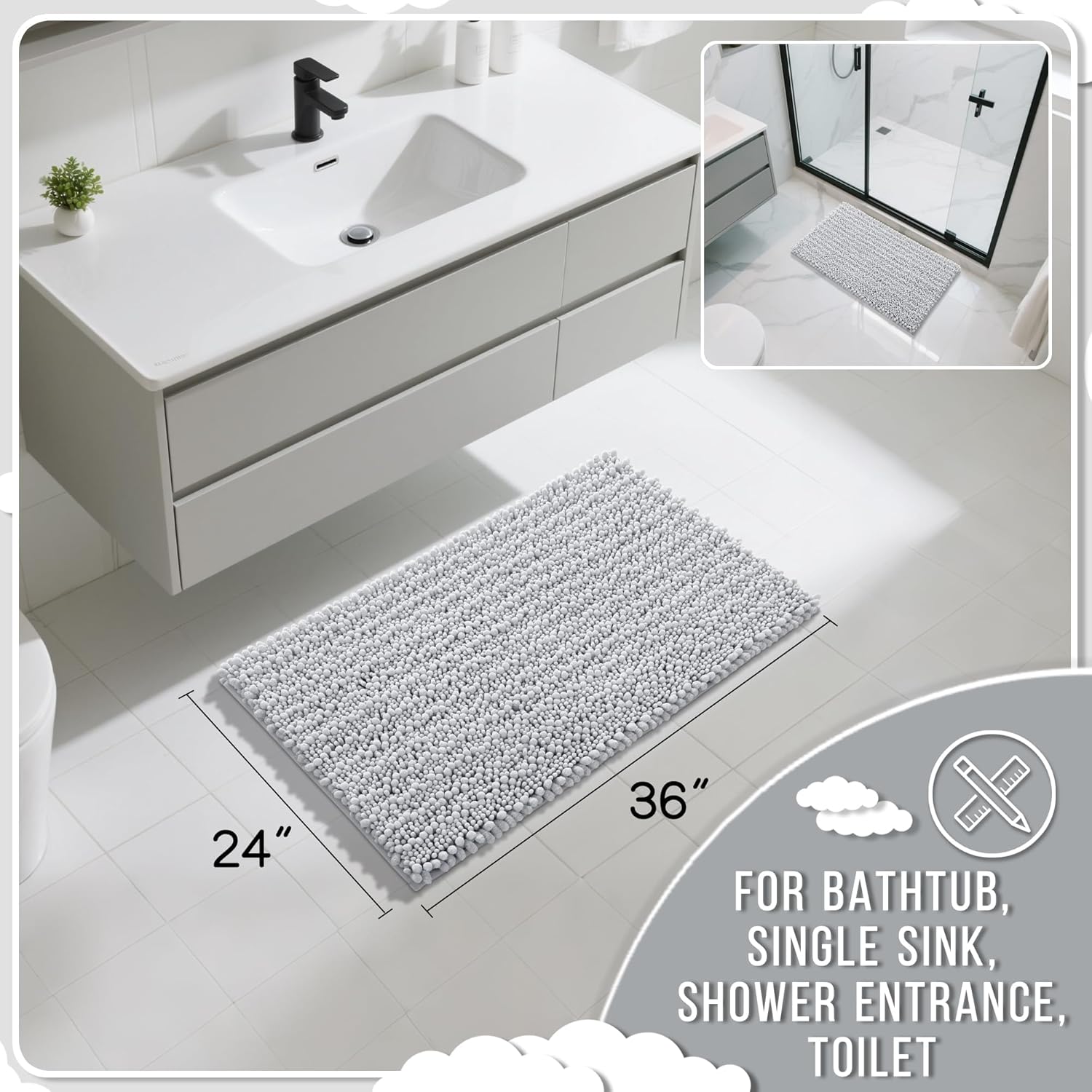 Yimobra Large Bathroom Rugs Non Slip Washable 36x24 Inch - Ultra Soft Absorbent Chenille Bath Mat, Quick Dry Shaggy Floor Carpet for Tub Shower, Silver Home Decor Accessories