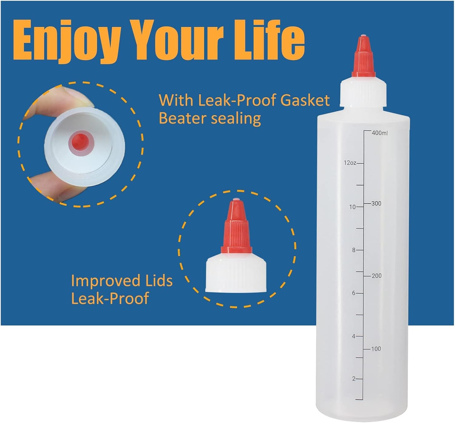 - Package Contains: 6 pack of 12oz (400ml) Graduated Squeeze condiment bottles with red twist-on cap lids, coming with extra 1 Silicone Funnel, 18 Chalk Labels, 1 Pen. When you full with bottle, it capacity is 420 ml(about 14 oz)