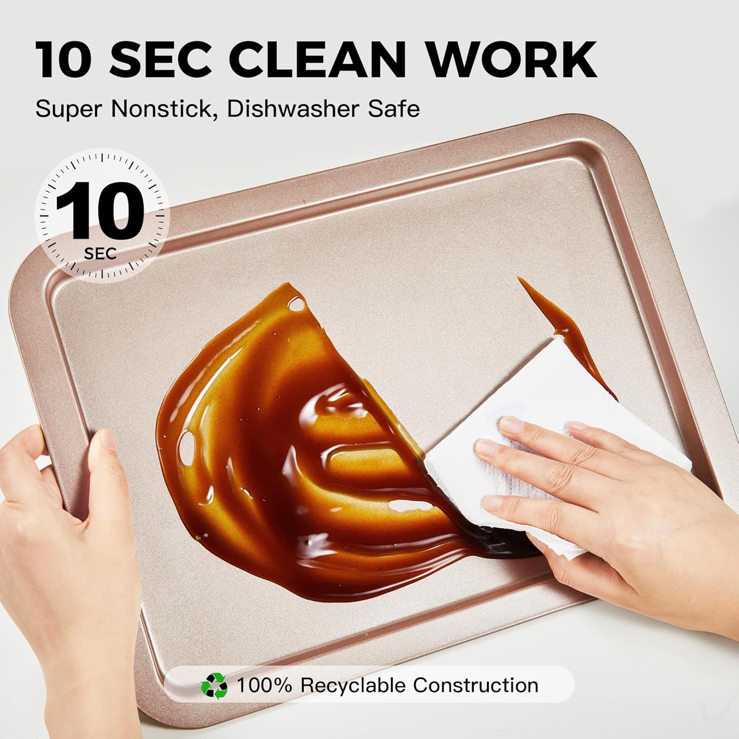 - SUPERIOR NONSTICK TECHNOLOGY - The baking pan set of 3 has a high-quality non-stick coating and inner and outer protective layers to ensure the perfect release of food. Non-stick baking sheet set can be used safely at temperatures up to 450Β°F, with even heat distribution, anti-warping, and long-lasting baking properties