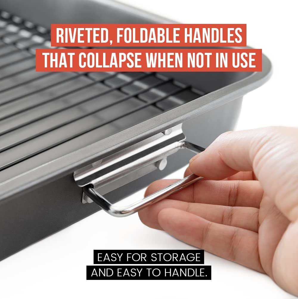 - ✅ MADE FROM HEAVY-DUTY CARBON STEEL: The design of our large roasting pan features sturdy, foldable, securely riveted handles. The strong wire rack can hold up multiple servings of food while allowing consistent heating. Roast turkeys with all the stuffing even ease!