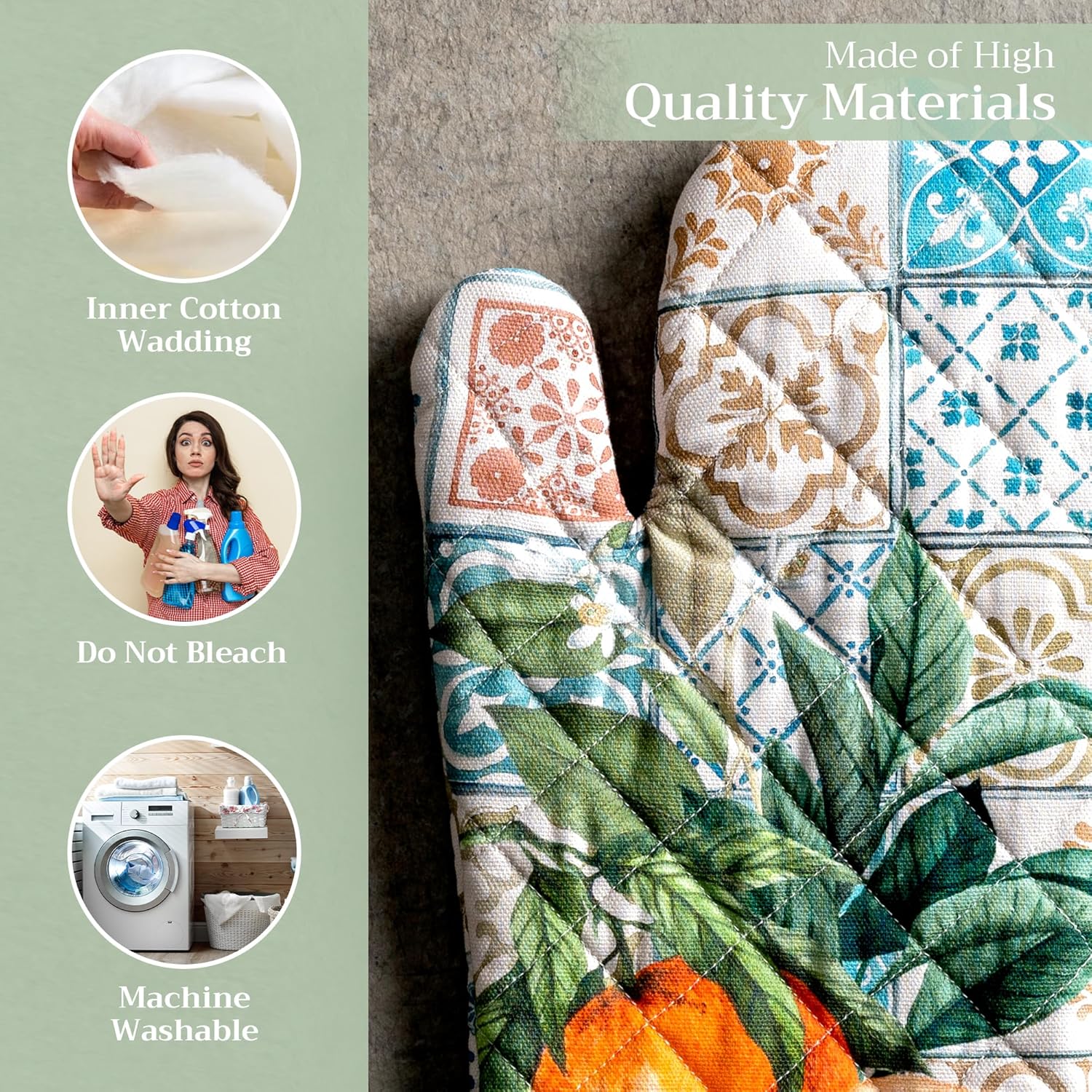 - 100% Quilted cotton: Crafted from thick, durable quilted cotton, this heat resistant oven mitt provides a soft feel, safe handling, and lasting performance. A must-have kitchen accessory for everyday cooking, roasting, or baking tasks