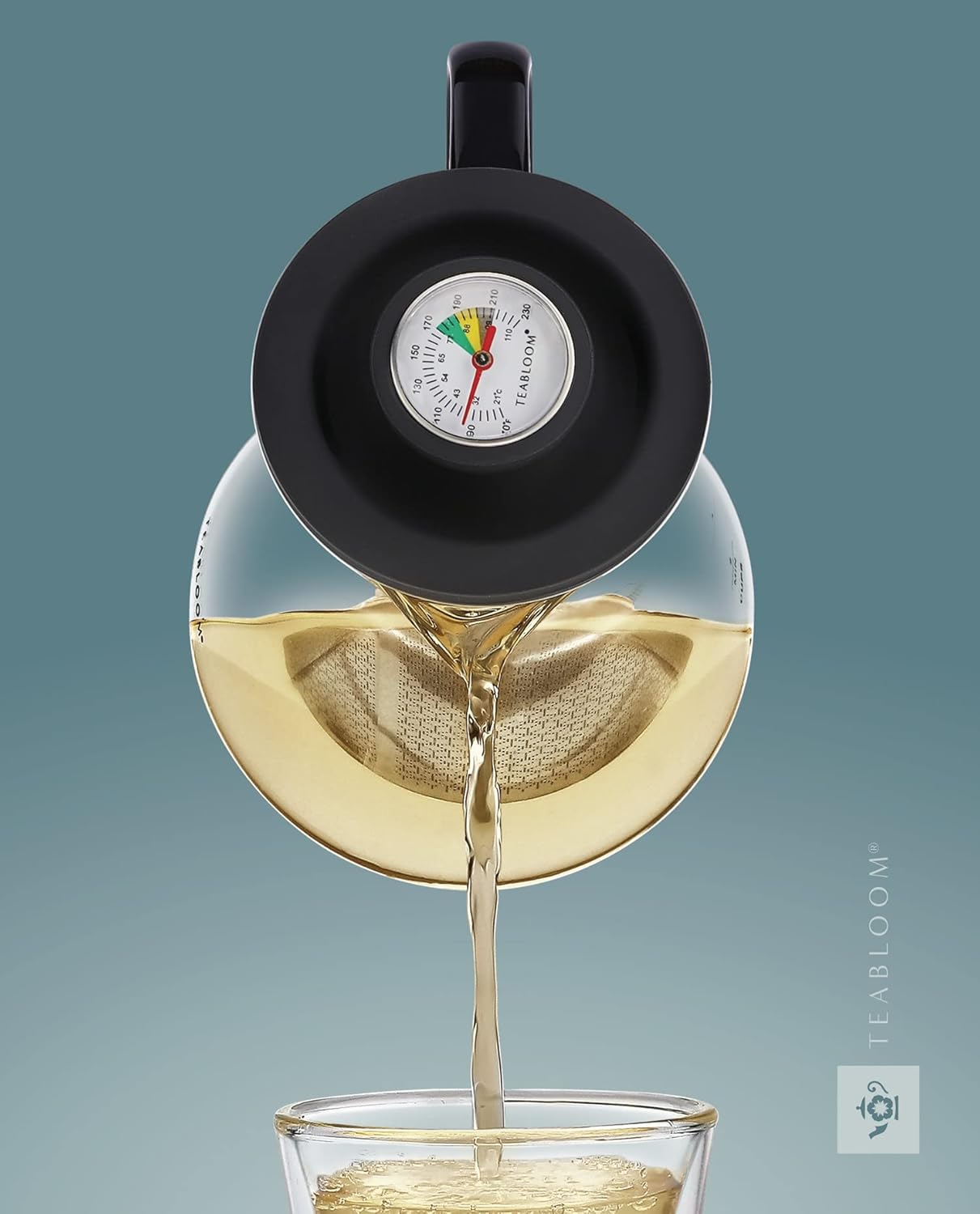 Teabloom 2-in-1 Tea Kettle and Tea Steeper - Glass Teapot with Thermometer and Stainless Steel Loose leaf Tea Infuser, No Whistle Kettles, Virtuoso 34-Ounce Tea Maker