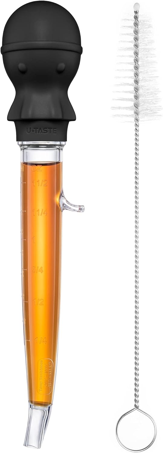 - [Heat Resistant Silicone and Tritan] U-Taste turkey baster is built to withstand hot juice. No melting issues. The cute octopus bulb is made of 600℉ heat resistant silicone and Food Grade food grade tritan body (Tritan is a temperature-resistant PCTG with a temperature resistance of -4~228.2℉). The clear-like-crystal texture lets you know what you are basting the food with. You can use it to baste turkey or ham, or to extract fat from baking meatloaf.