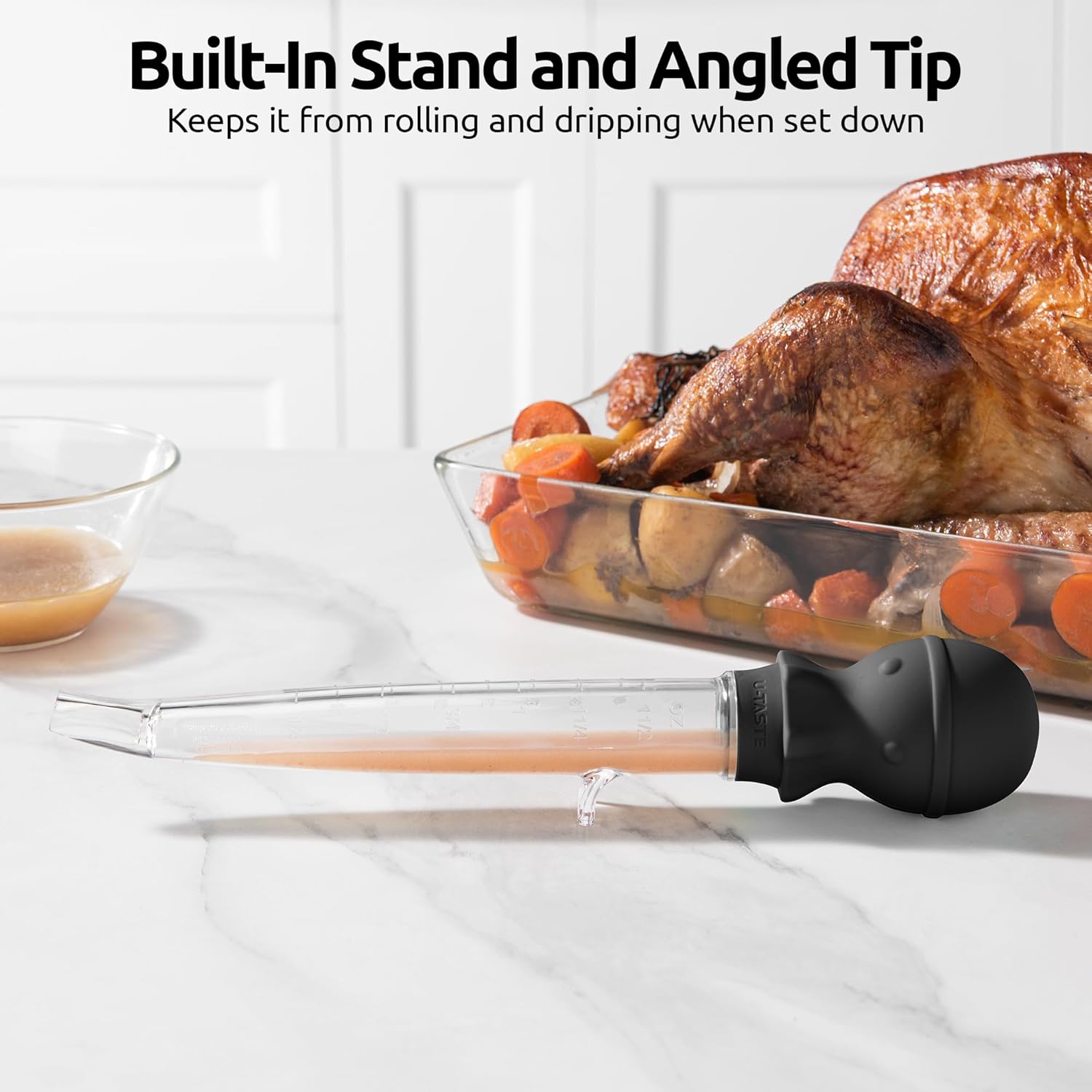 - [Built-In Stand and Drip-Proof Curved Tube] Since it is hard to baste a turkey thoroughly in 1 trip, and is not every time you can have a spoon holder right within touch, the built-in foot should be a bonus to you. The little stand helps to keep the tube stay in place on the counter, instead of rolling around and messing up your cooktop. And slightly curved tip will keep “up” not touching the surface when set down and the liquid can be hold back in the tube to keep leaking and dripping.
