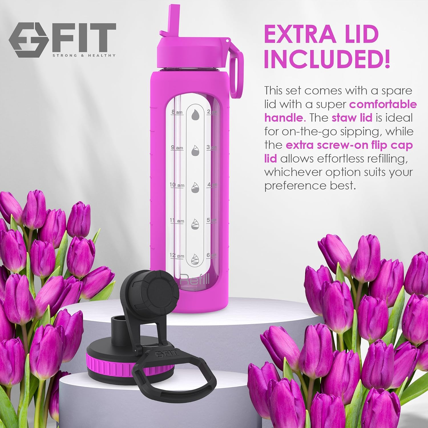 - Extra Lid Included: This bonus lid is designed for versatility and convenience; no worries if you misplace the straw lid; this spare lid ensures that you can continue enjoying your glass water bottle for an extended period of time; the straw lid is perfect for on-the-go sipping, while the extra screw-on flip cap lid allows for effortless refilling or whichever option suits your preference best