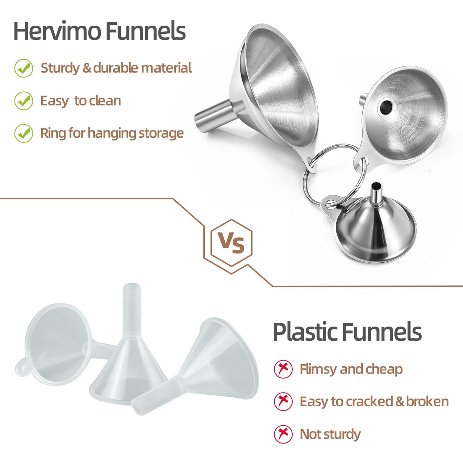 - Durable & Safe - These metal funnels are made of food-grade stainless steel and are heat resistant. You don't have to worry about them breaking like plastic ones.