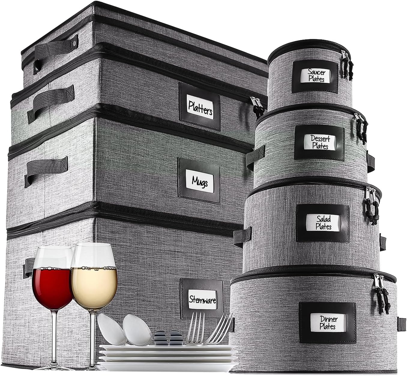- Fine China Storage Containers: Protect your china dinnerware from dust, chips, scratches, or accidental impacts. Our dish storage containers fit plates, cups, stemware and cutlery for up to 12 place settings, and 4 wide platters.