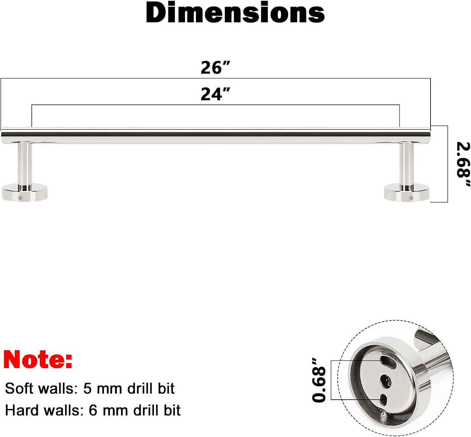 - DIMENSIONS & USE: Overall length is 26" (670mm). The length of hanging space is 24" (605mm). 22-Lbs (10kgs) max weight capacity. You can mount this towel bar to either side of your cabinet or closet door for storing at-use hand and dish towels. It can also be used with S hooks, hanging bath balls, hairdryers, teacups, spoons, clips, etc.