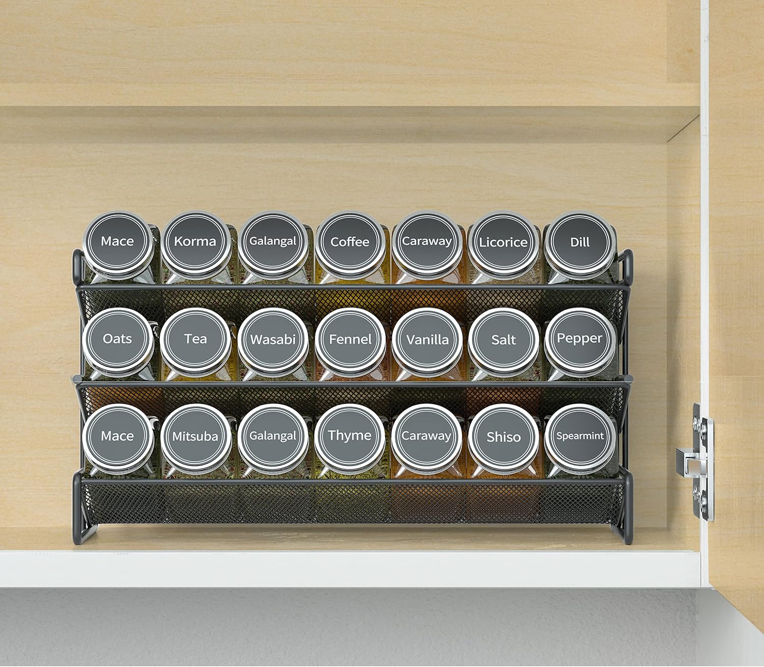 SpaceAid Spice Rack Organizer with 21 Spice Jars, 386 Spice Labels, Chalk Marker and Funnel Set for Cabinet, Countertop, Pantry, Cupboard or Door & Wall Mount - 21 Jars, 13.4" W × 9" H, Black