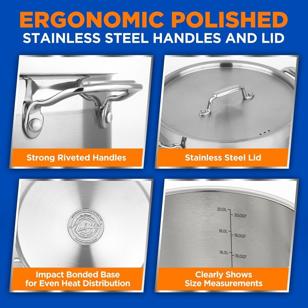 - DURABLE STAINLESS STEEL CONSTRUCTION - Made from heavy-duty stainless steel, this stockpot is built to last. The impact-bonded base ensures even heat distribution for superior cooking performance.