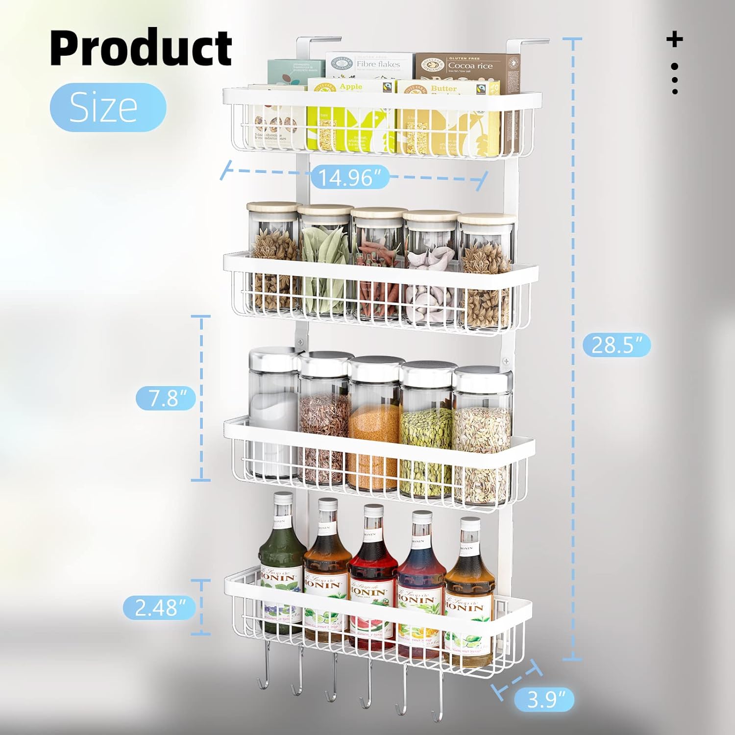 - ➤【Well Made and Very Sturdy】 Magnetic spice rack made of high quality metal steel. The way it's built and where the magnets are placed, it's very sturdy and stays where you put it even without the extra adhesive strips they included! Very suitable for placing seasoning bottles, spices, plastic wraps, snacks or drinks and other goods used regularly. The two metal rods combine the four baskets, which greatly increases the load-bearing capacity of the shelf. Holds up to 50 Lbs.