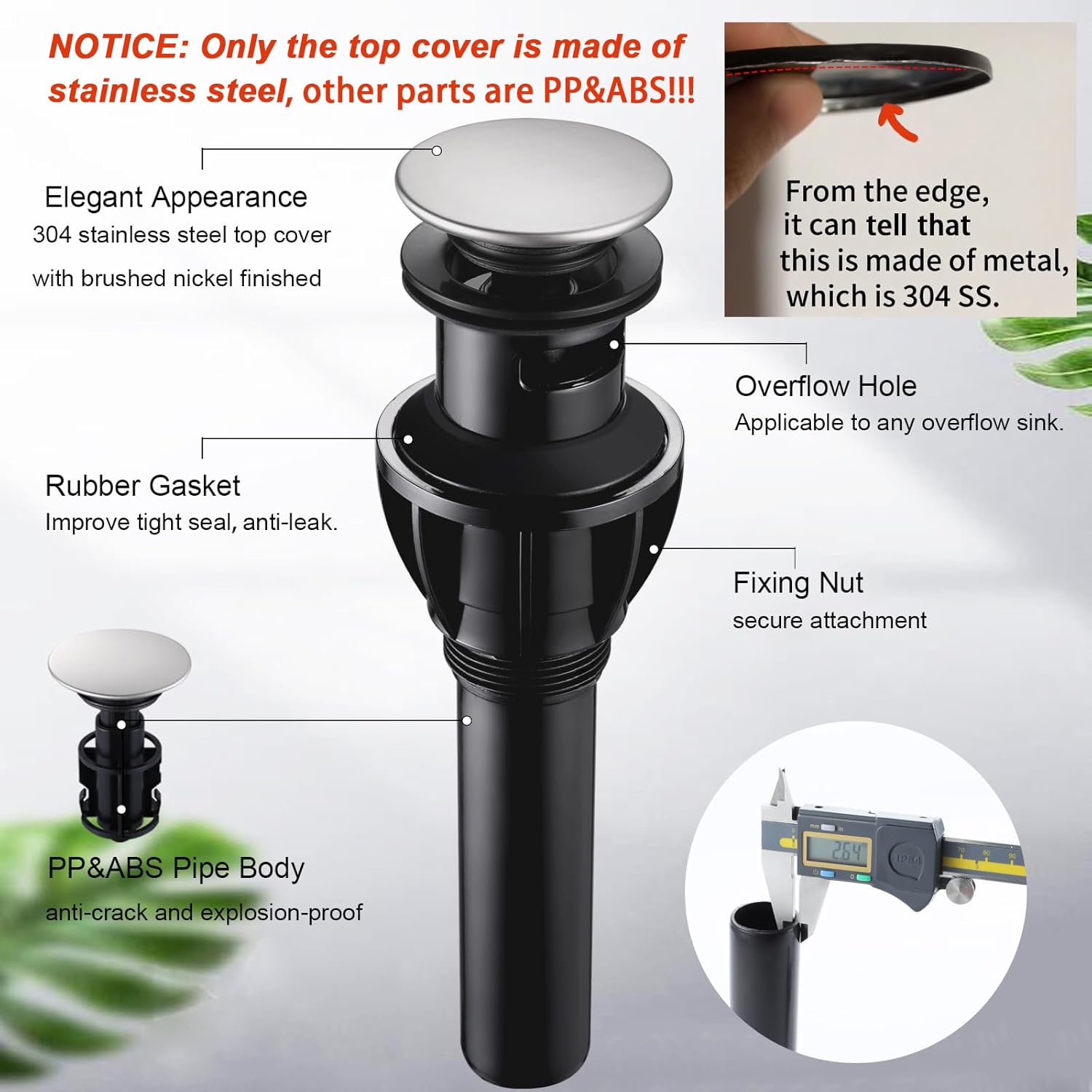 - ✓【304SS TOP SURFACE+ABS&PP BODY】The top surface of bathroom sink drain is made of high quality 304 stainless steel with a multi-layer brushed nickel finish. Bottom pipe is made of PP and ABS. This combined structure not only resists rust, but also resists corrosion and cracking.