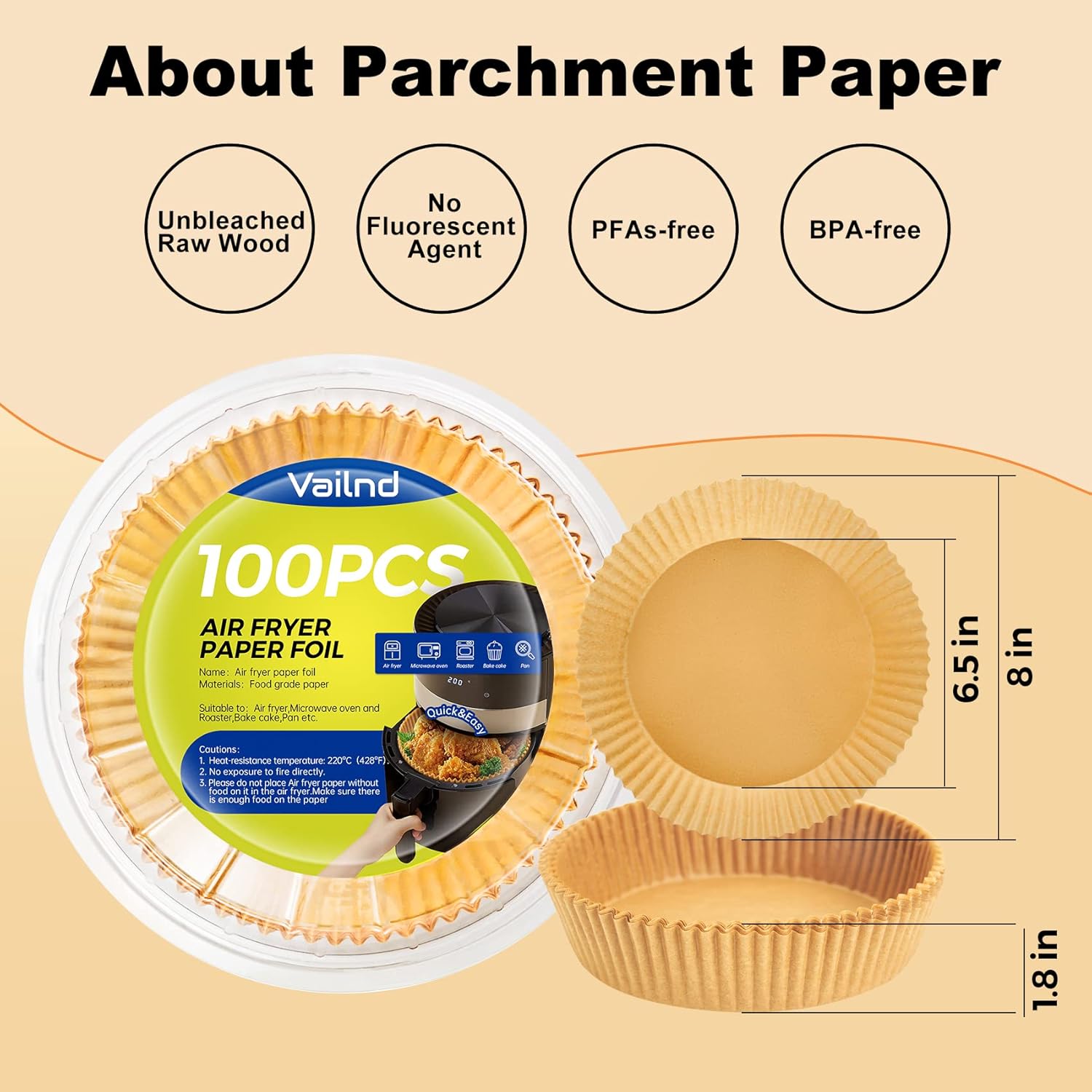 - Healthy & Reliable Materials: Vailnd air fryer parchment liners are made of raw wood and food grade silicone oil coating, unbleached, no fluorescent agent, BPA-free, PFAs-free, making your baking safe, non-toxic and free from food mes