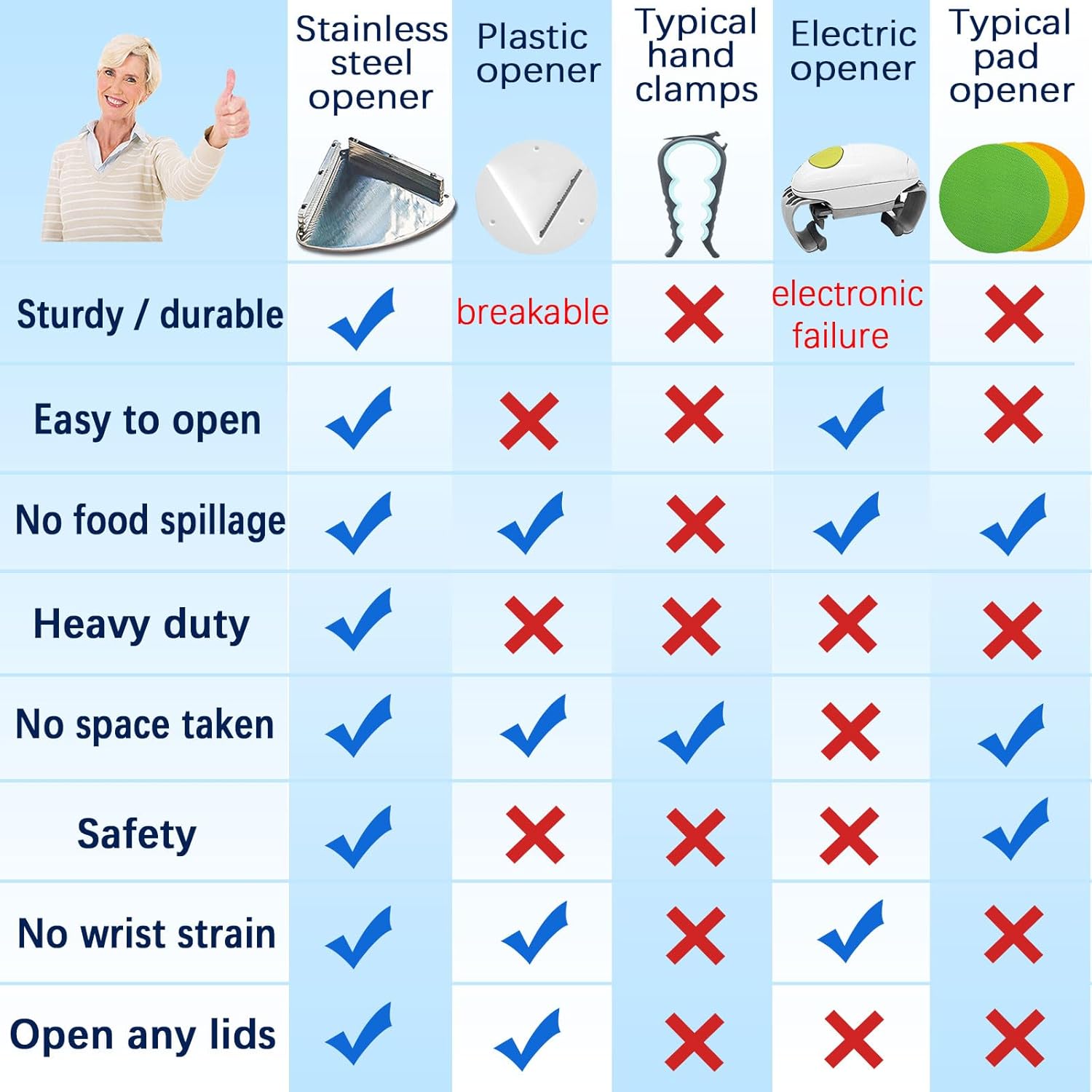 - Upgraded Stainless Steel Jar Opener -- Our Jar Opener made of all stainless steel, the stainless steel teeth are hardened, super wear-resistant and never rust. Stronger and more durable than plastic jar opener, simpler and longer life than electronic automatic can opener, no batteries, no worries about plastic arms breaking and electronic failures.