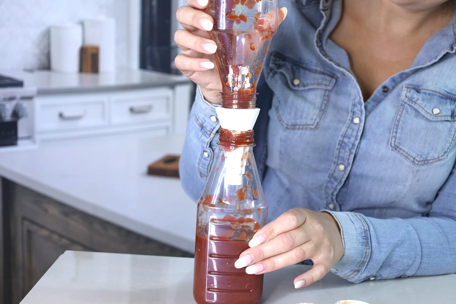 - Multiple Kitchen and Bath Use – Ideal for lotions, shampoos, and conditioners in the bathroom or ketchup, mustard, and other condiments in the kitchen this bottle-to-bottle transfer connector works with bottles of all shapes and sizes.