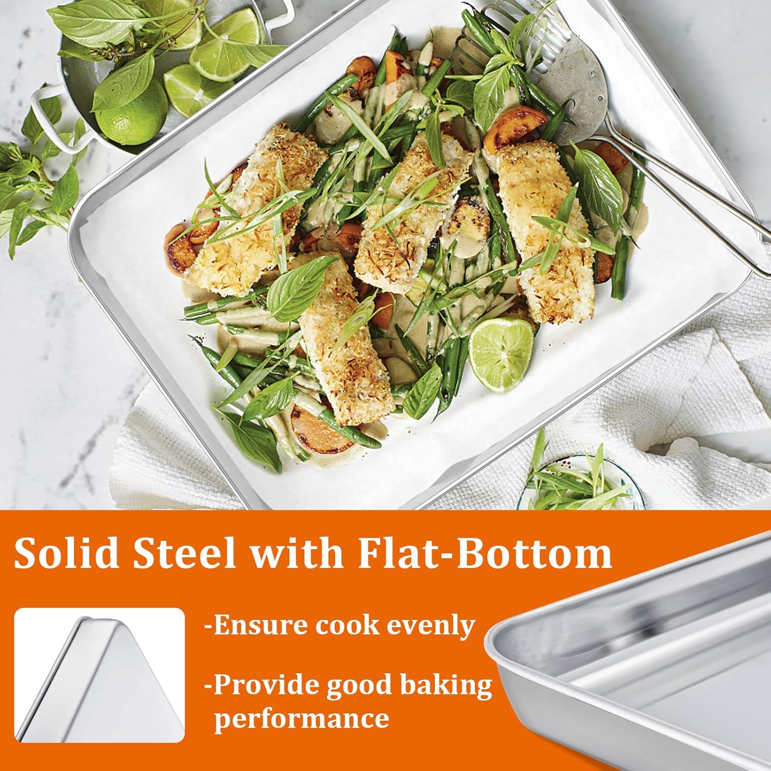 - 【HEALTHY & STURDY】Made of pure stainless steel without toxin, Ensure no harmful substances leaching on to food at high heat baking, Heavy-gauge steel stands up to the rigors of daily cooking, Better rust-proof and no easy warp, Superior to aluminum/nonstick coating pan, Durable enough to last a lifetime