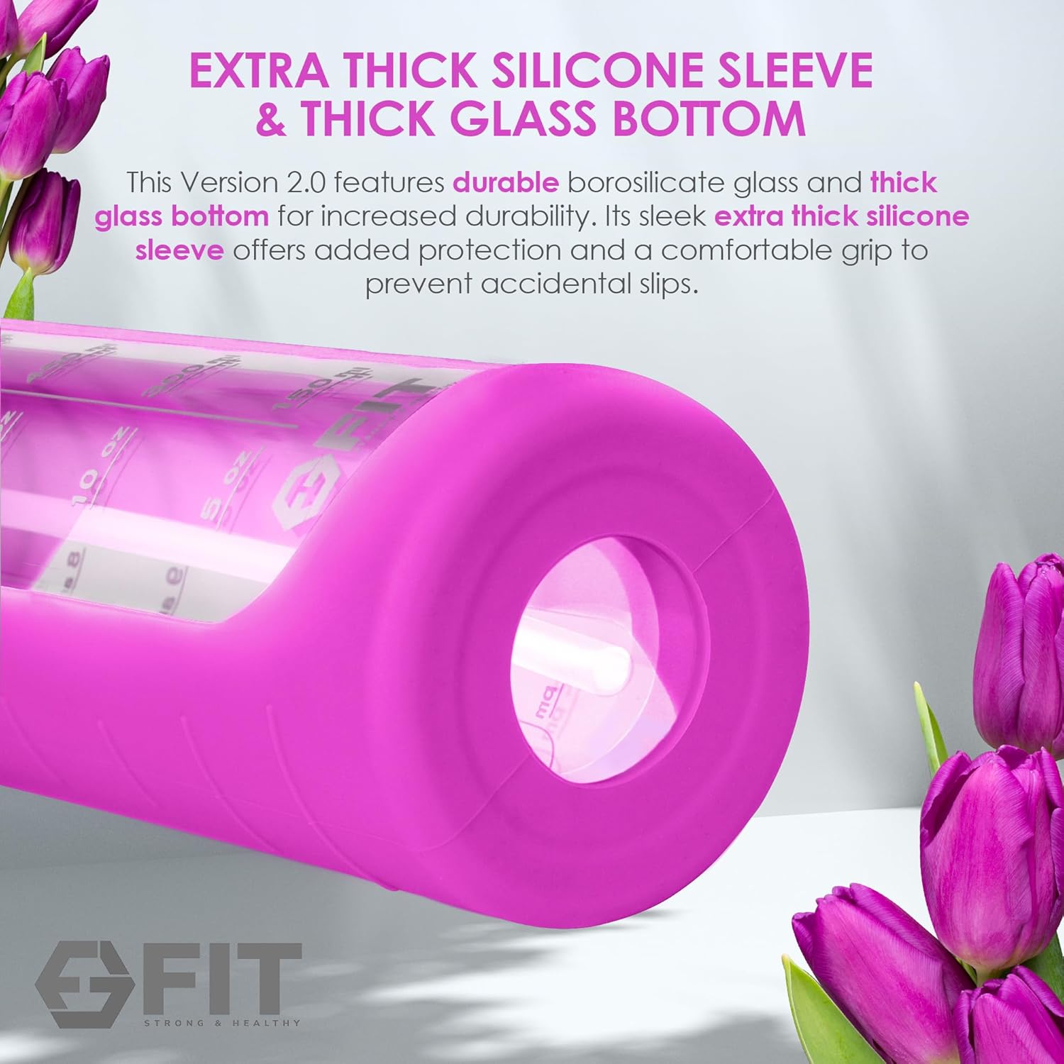 - Water Bottle and Cleaning Brush Set: Upgrade your hydration routine with our 32 oz Glass Water Bottle with Time Marker and Cleaning Brush Set; this version features an extra thick silicone sleeve for extra protection, insulation, and a secure grip; we've also upgraded one of the lids to a straw lid for sipping on the go; the 32-inch Water Bottle Brush is made from durable silicone material, which effectively removes dirt and residue; plus, it does not absorb unpleasant odors and stains
