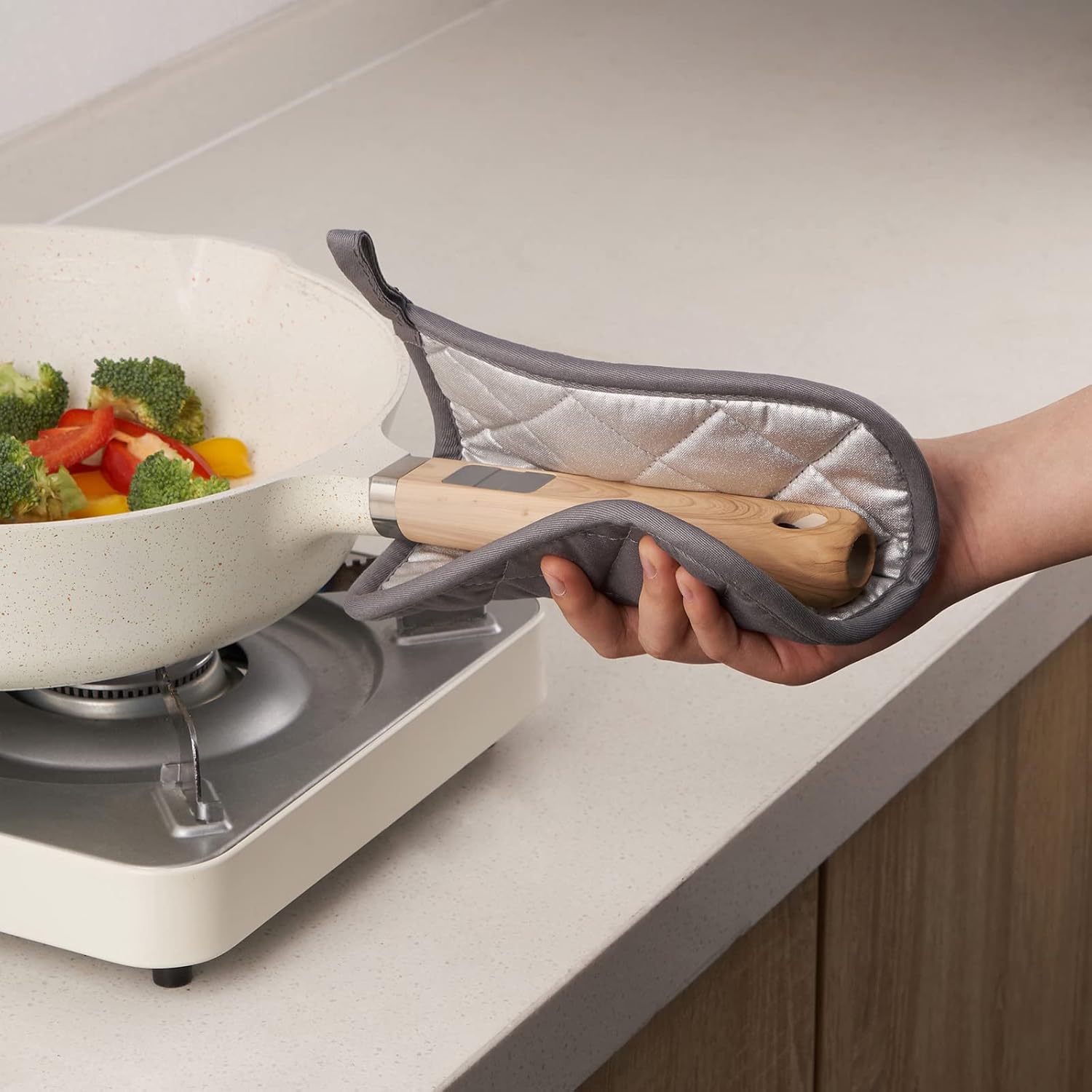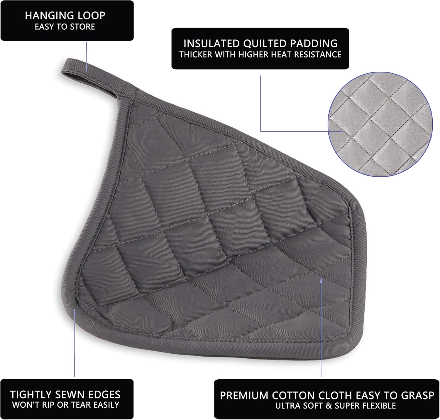 - QUALITY PRODUCT: 100% terry looped cotton on one side and a heat resistant silverstone lining on the other with pure cotton filled. Hanging loop allows for easy storage, easy to clean, durable.