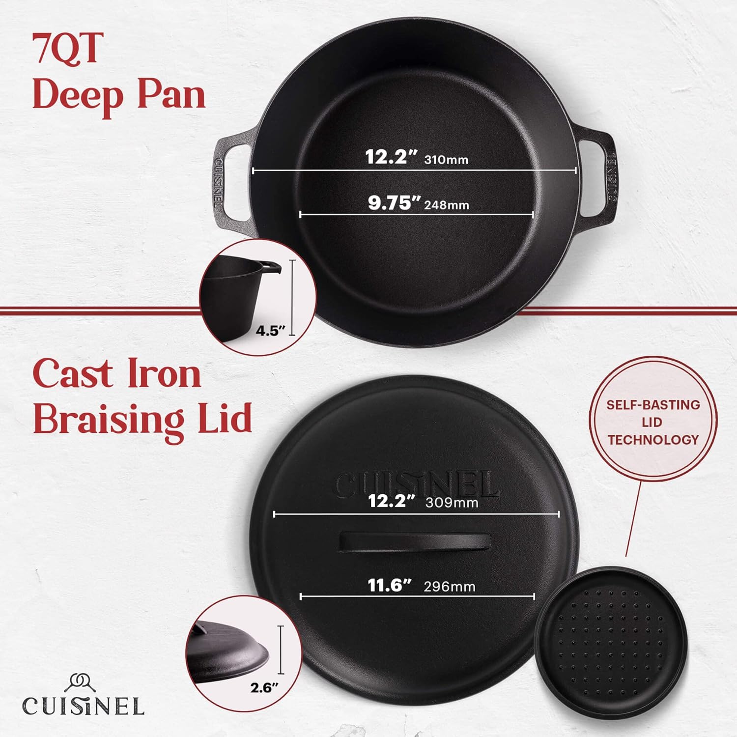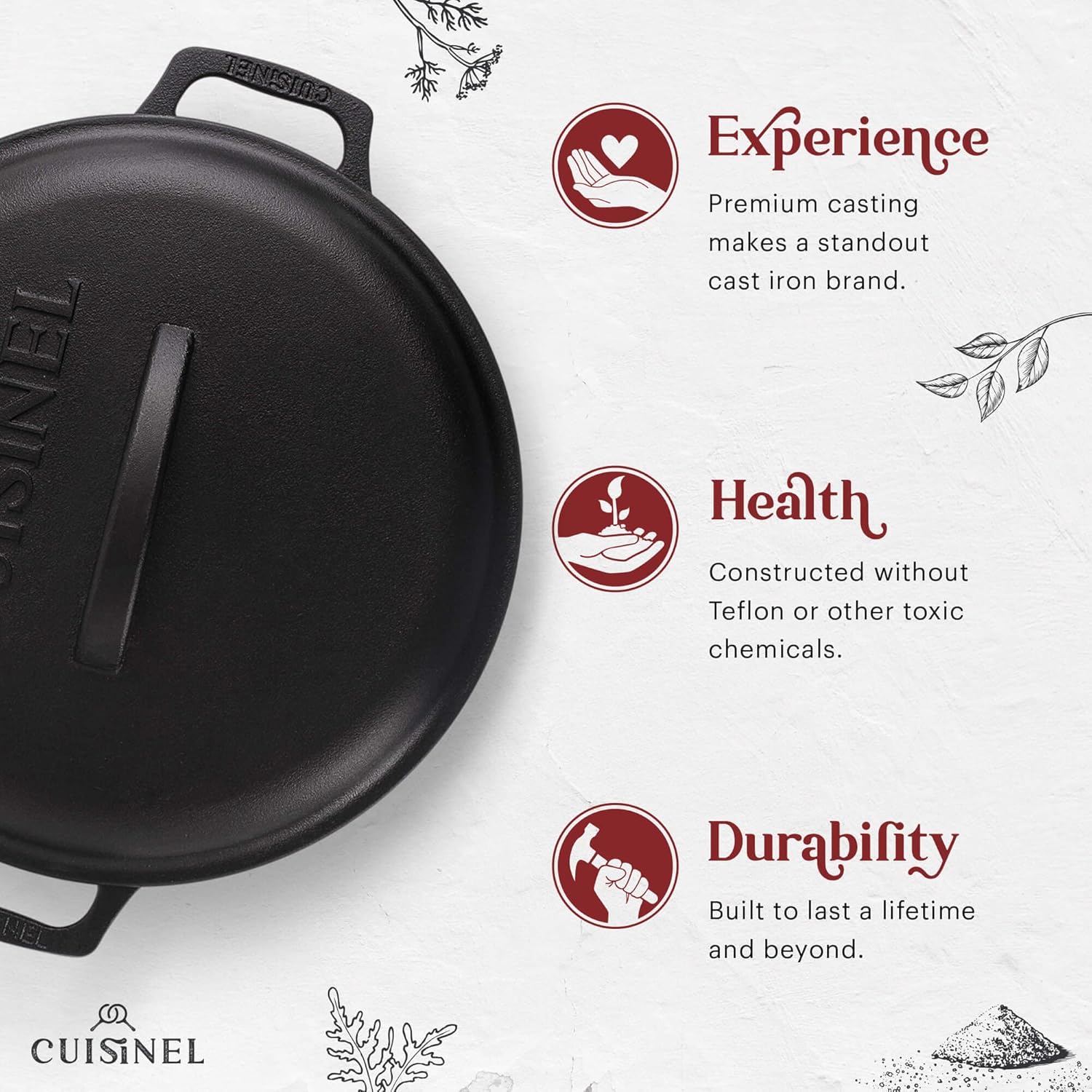 Cuisinel Cast Iron Dutch Oven - 7-Quart Deep Pot + Lid + Pan Scraper + Handle Covers - Large Pre-Seasoned Cooker for Baking Bread, Soup, Frying - Indoor/Outdoor Kitchen, Camping, Fire, BBQ Safe