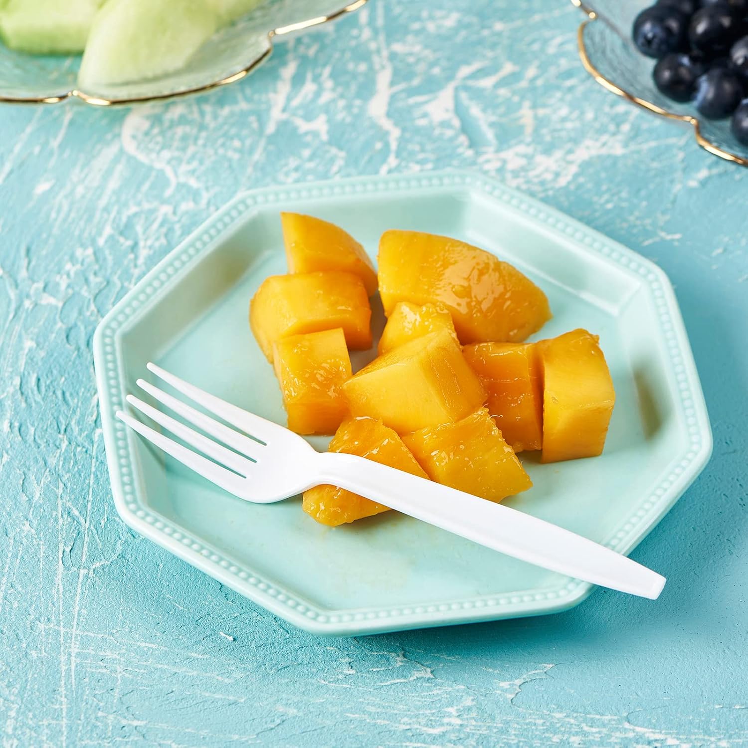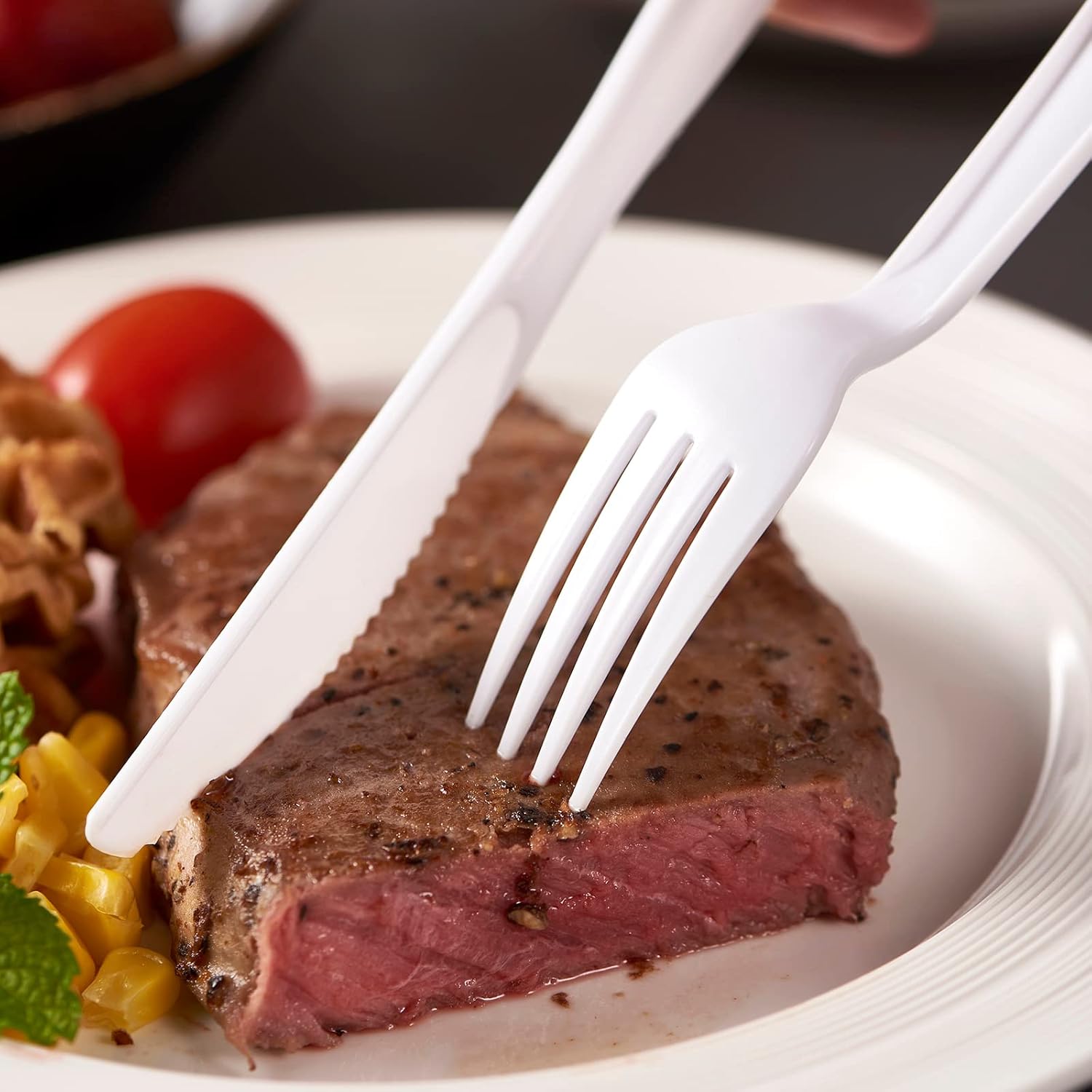 - EXTRA HEAVY WEIGHT CONSTRUCTION - Heavy duty, disposable, plastic forks. The heavyweight plastic construction is made of food-grade plastic that is very sturdy, and ideal for solid foods like steaks, salads, fish, corn and more.