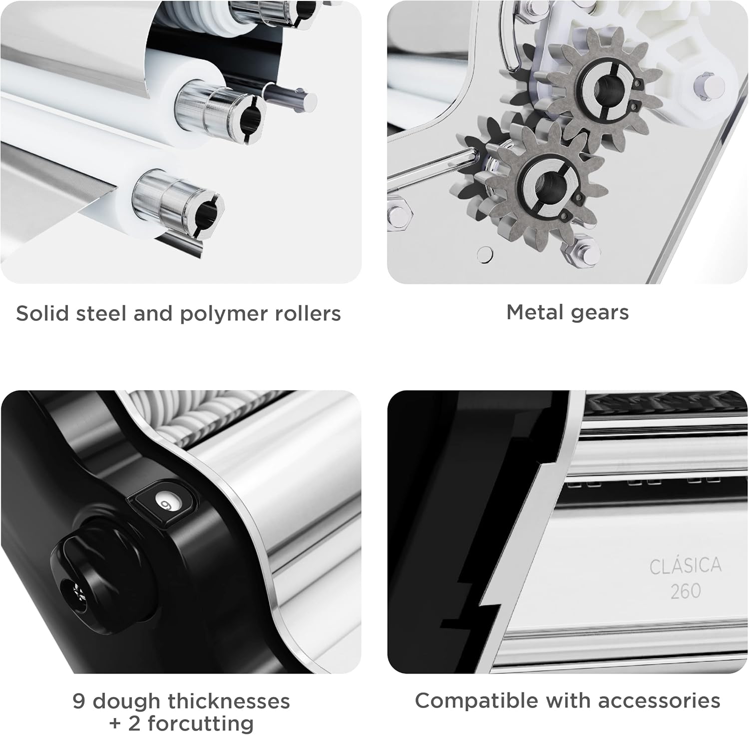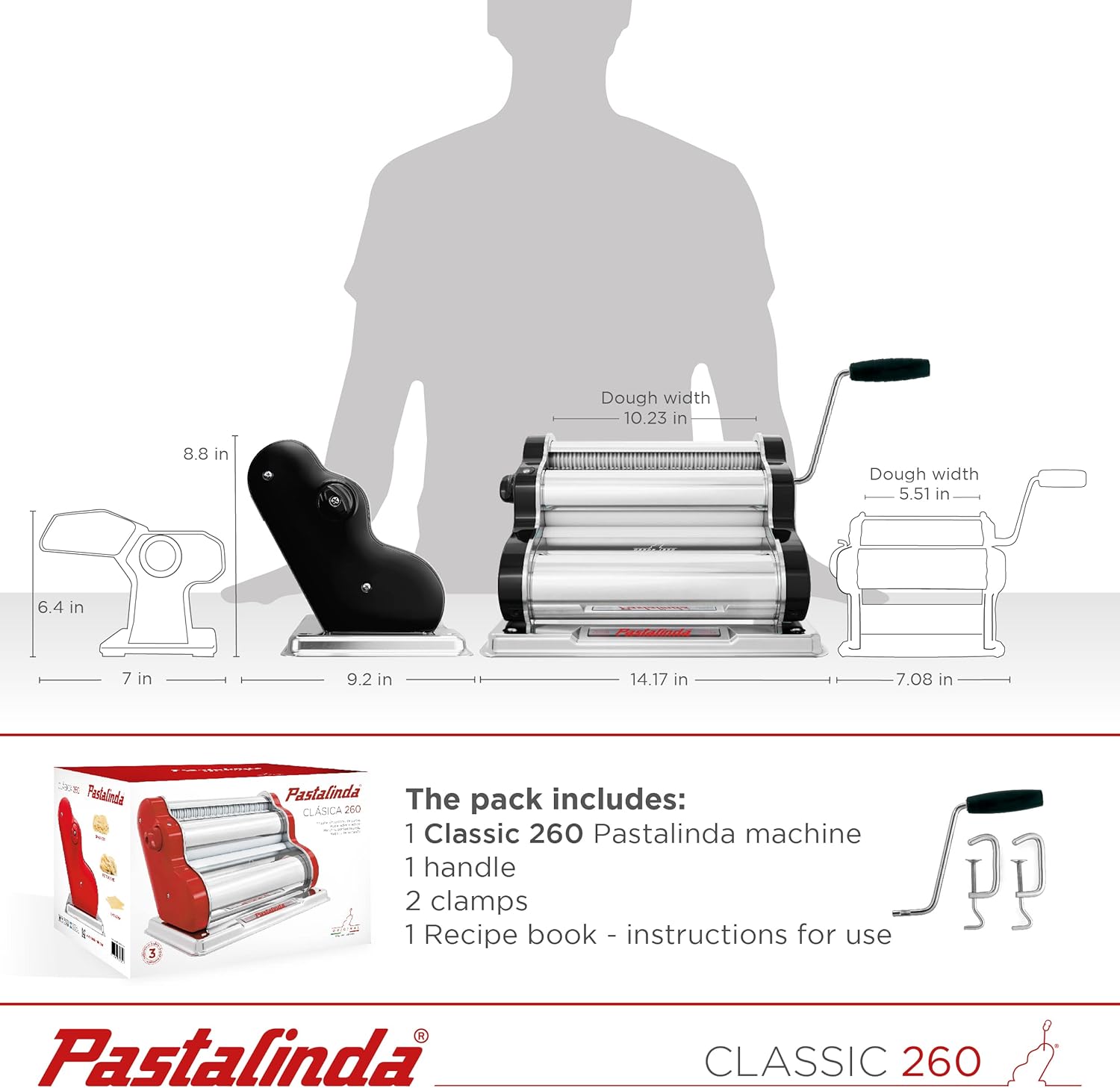 PASTALINDA Classic 260 Pasta Maker Machine, 26 cm Wide Rollers, 9 Thickness Positions, 2 Cutting Positions, Stainless Steel. Includes Reinforced Hand Crank And Two Clamps (Black)