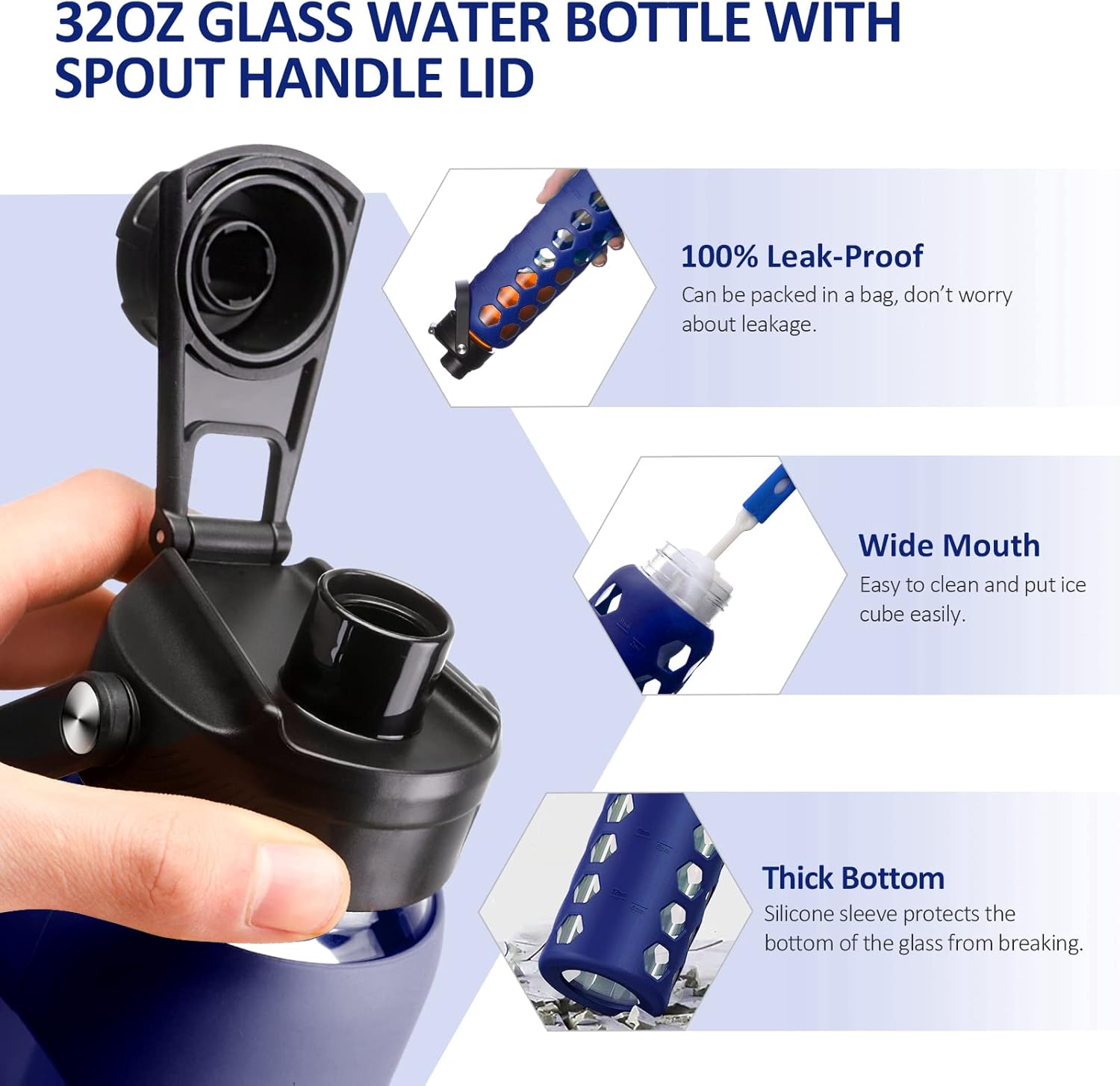 MUKOKO 24oz Glass Water Bottle with 2 Lids-Handle Flip Lid&Bamboo Straw Lid,Motivational Water Tumbler with Time Marker Reminder and Silicone Sleeve, Leakproof-Blue