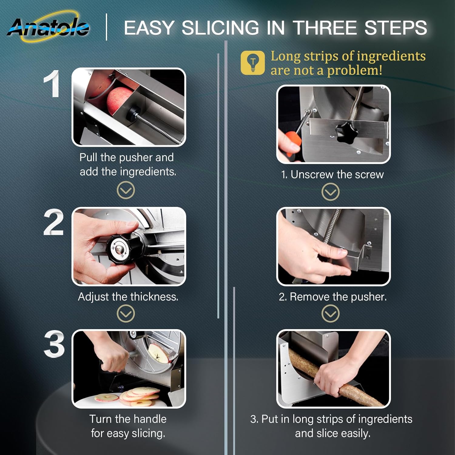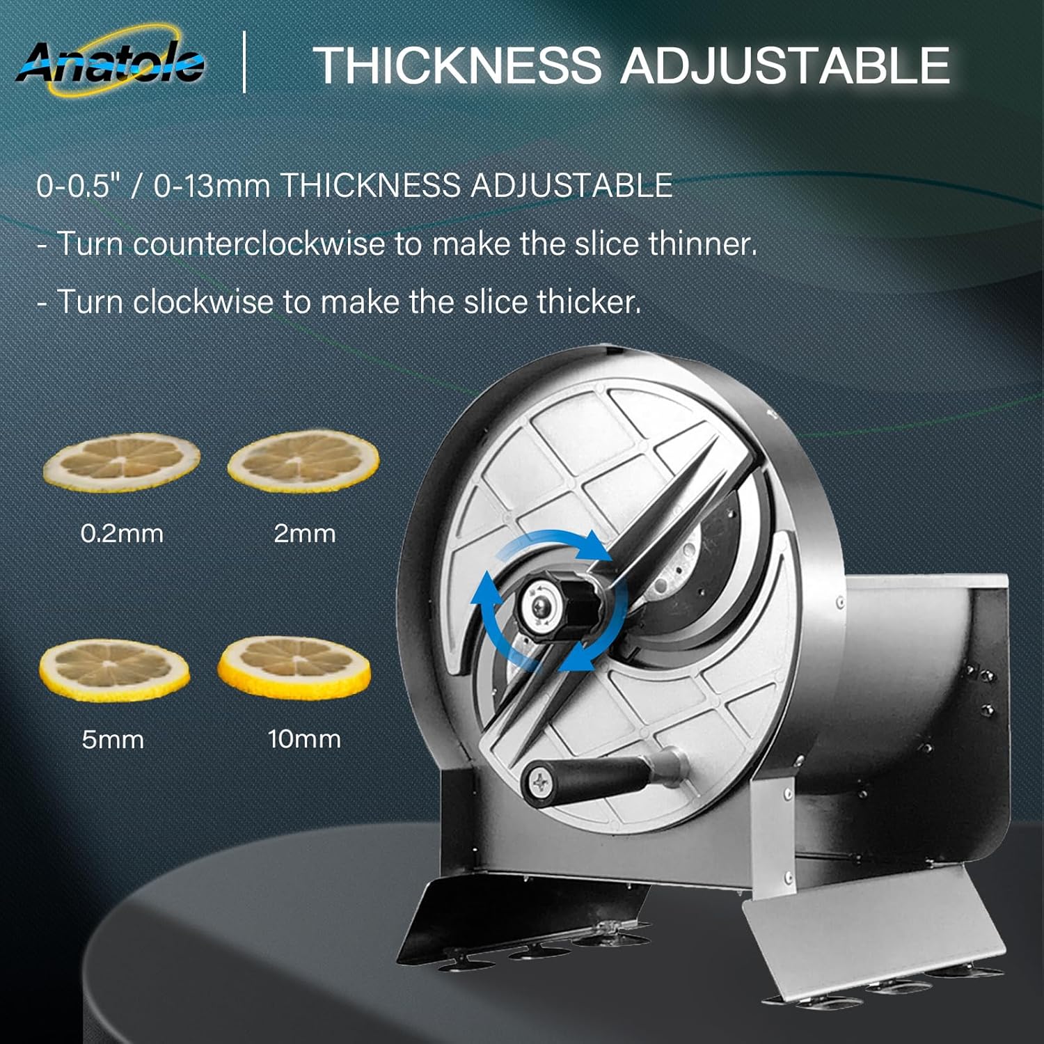 - 0-0.5'' (0-13 mm) Thickness Adjustable: Rotate the control knob counterclockwise for thinner slices and clockwise for thicker slices; to meet different needs
