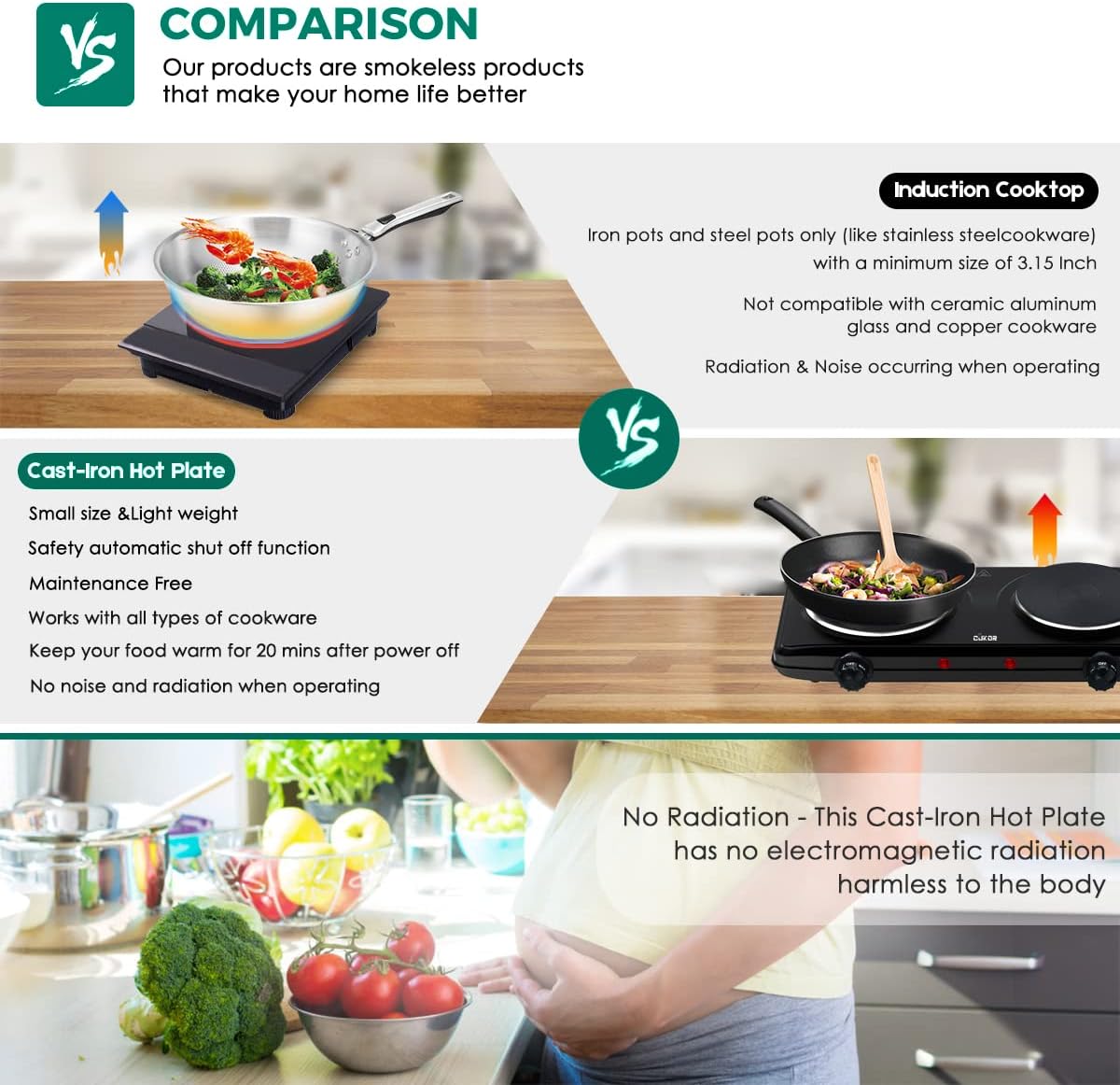 - SAFE and DURABLE: The double burner is no radiation, no open flame, no carbon monoxide, It's designed with voltage and thermal regulators to ensure your safety while cooking. Built with stainless steel, it will support cookware as heavy as 22 lbs