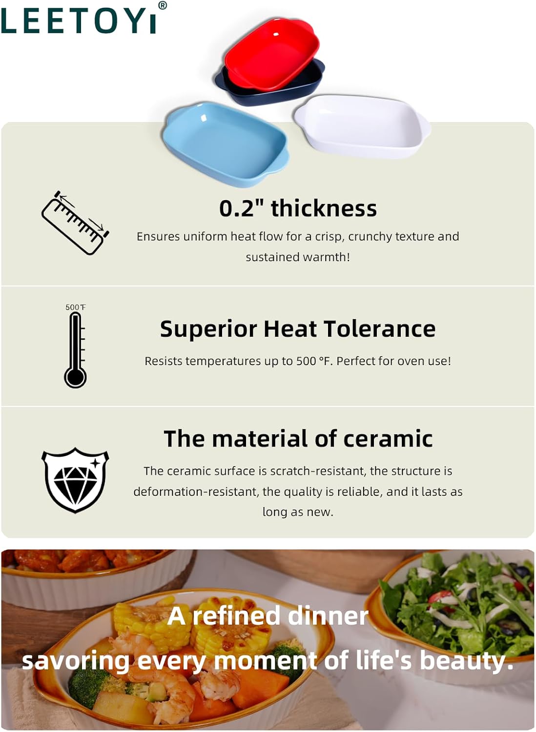 - Ceramics:This Baking Dish is made of ceramic. This baking set surface is smooth and bright, and it is very easy to clean.At the same time,It can be used in the oven, microwave, freezer and dishwasher. NOTE: No induction cooker and direct fire
