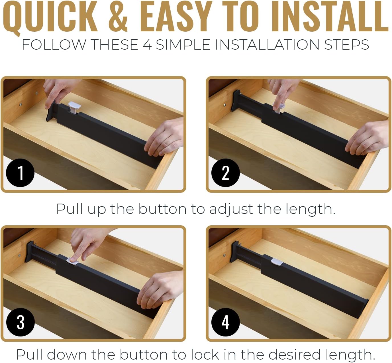 - Special Feature : Adjustable length (11” to 17”), one-click installation, soft EVA ends for drawer protection, and a modern finish. Adjustable length (11” to 17”), one-click installation, soft EVA ends for drawer protection, and a modern finish.