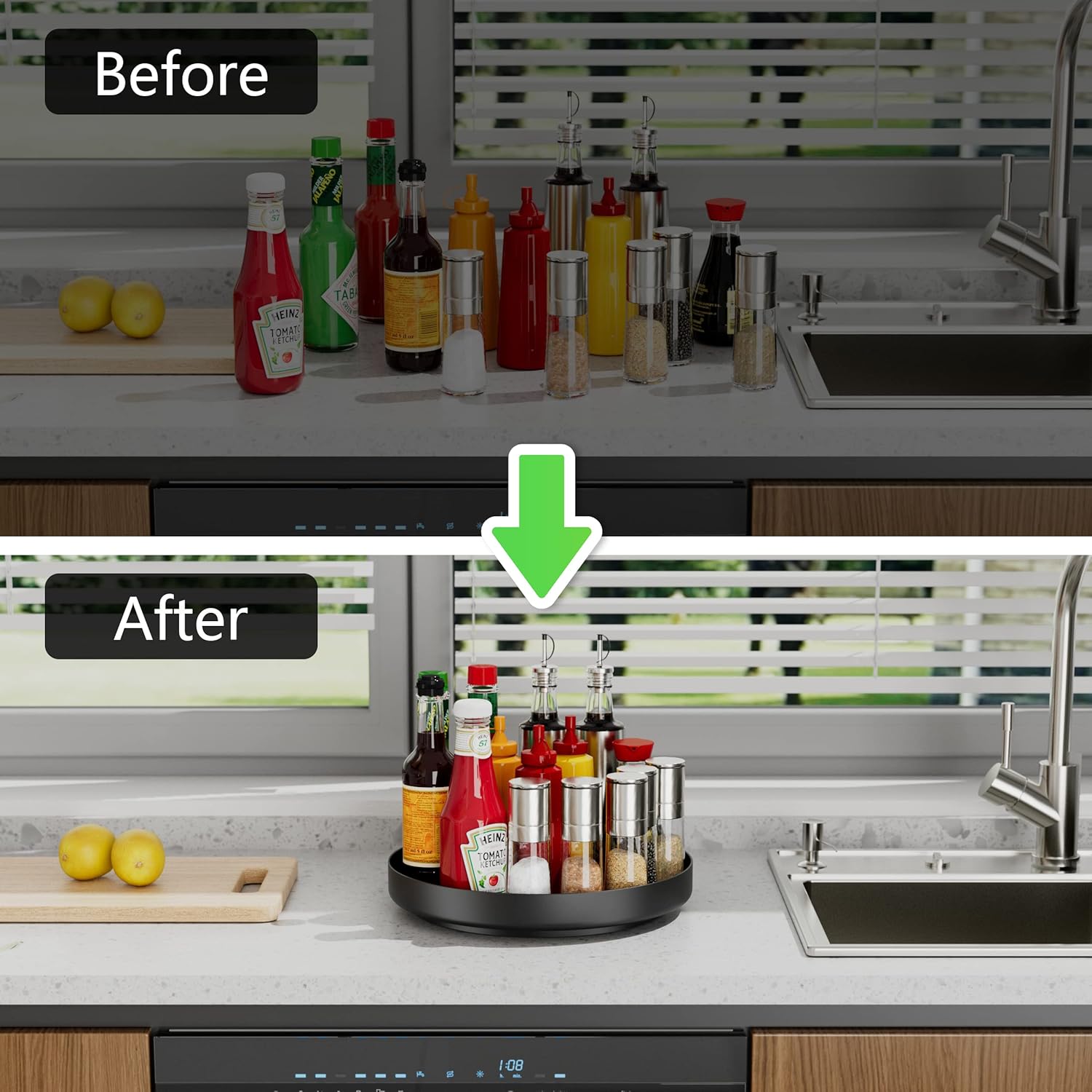 - 360°Rotating ,Easy to Reach:This Lazy susan tray is equipped with steel ball bearings,which can rotate 360° smoothly ,ideal for deep cabinets,corner pantry or under the sink storage, make it easy to reach what you need without knock over any bottles.With large rotating base and anti-slip pad design makes this spinner organizer more steady and firm.