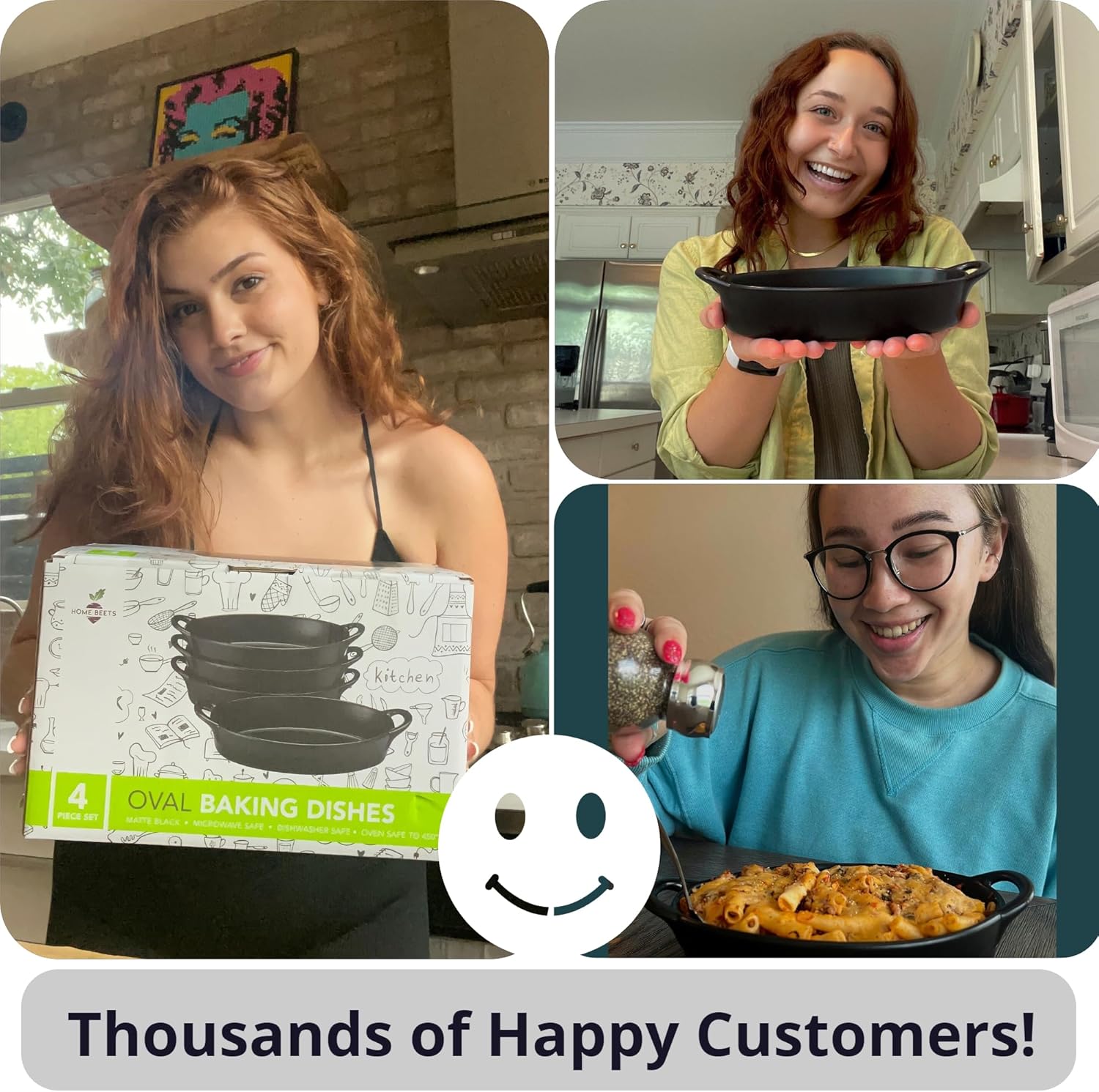 Oval Au Gratin Baking Dishes for Oven Safe and Microwave Cooking and Baking, 4 Pc. Set, Heat Resistant Ceramic with Handles for Serving, Small Mini Casserole Dish, 8" x 5", 16 oz, Matte Black