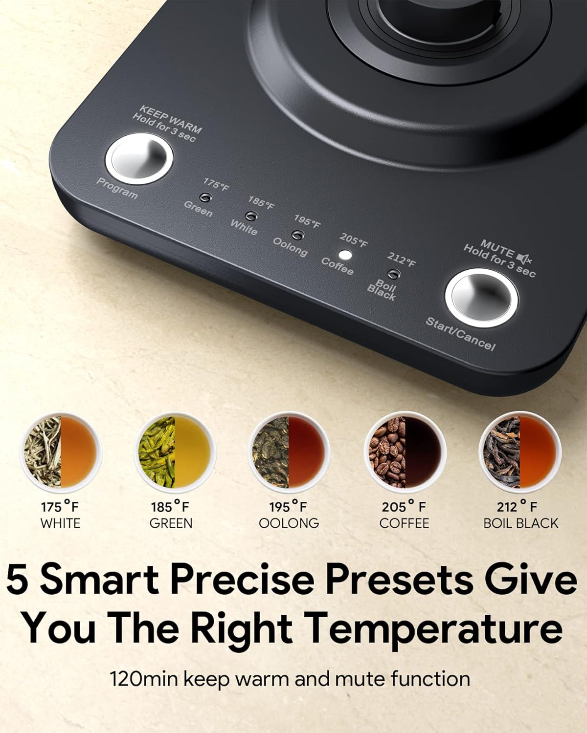 - 5 Smart Temperature Preset - The preset are 212-205-195-185-175Β°F, suitable for Black tea, Coffee, Oolong, Green tea, White tea, etc. Various temperature presets to meet different needs. The accurate variable presets allow you to never again burn your coffee or tea leaves.