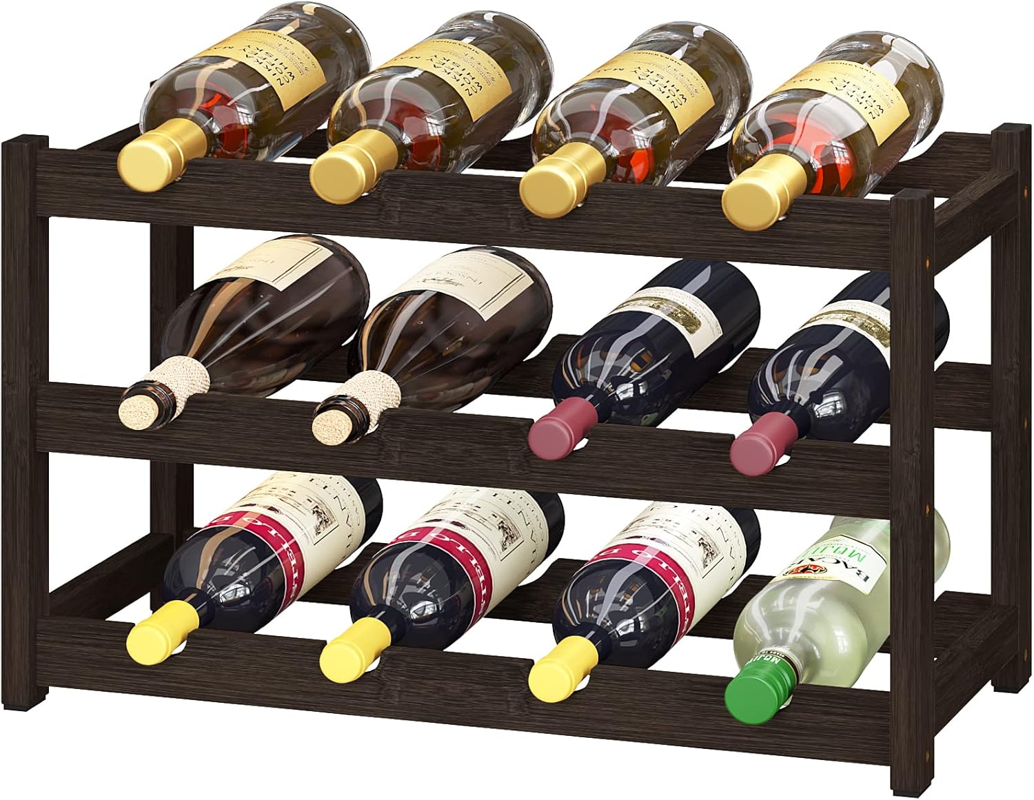 - MORE CONVENIENT STORAGE-UP TO 12 BOTTLES OF WINE: The 3 tier wine rack can accommodate a total of 12 bottles of about 750 ml of red wine or other wine of the same size, making it easier for you to store wine; This wine rack freestanding floor is a good choice for wine lover