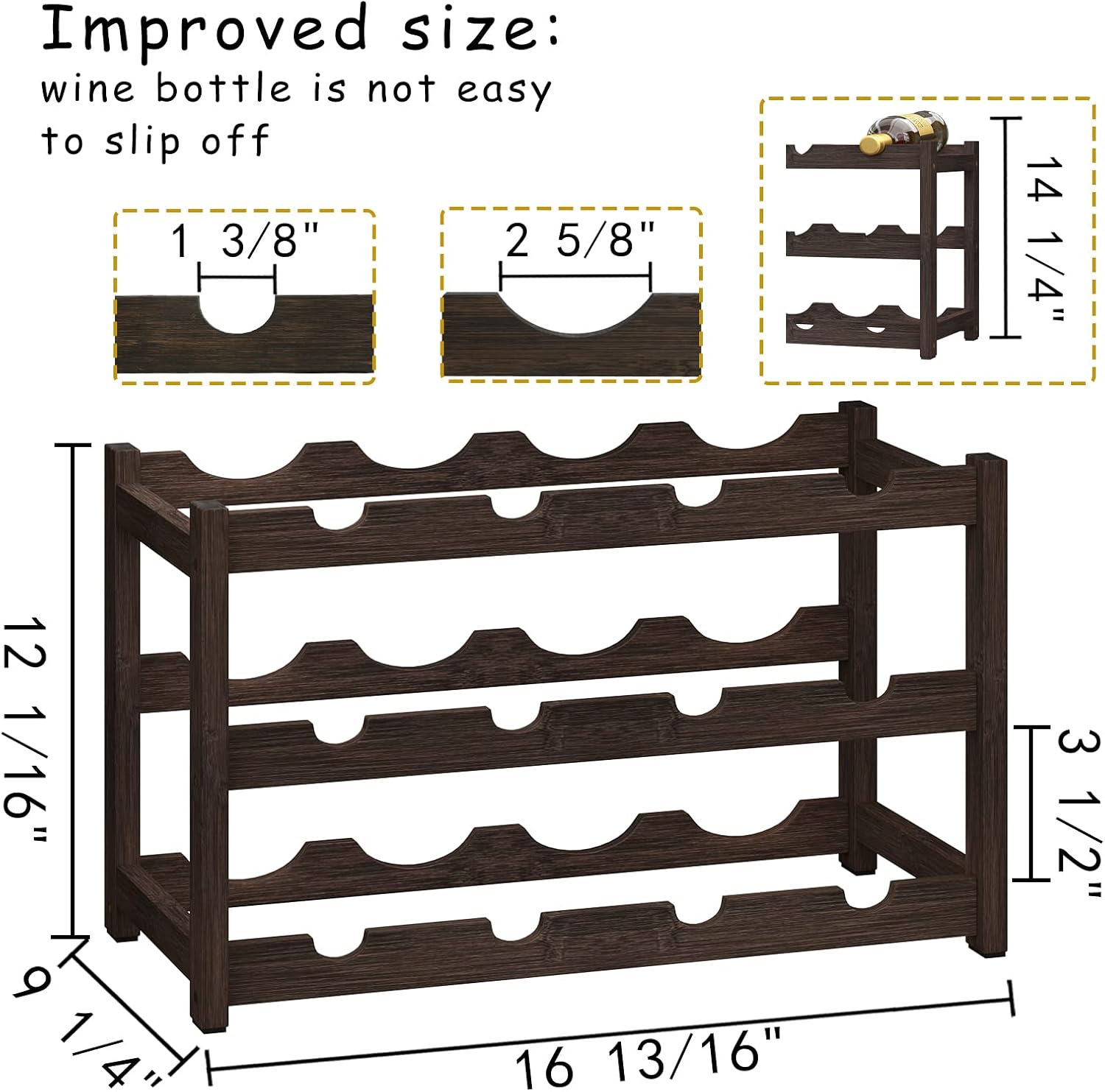 - REFUSE TO SLIP-BOTTLE DIAMETER DESIGN: If you're worried about slipping bottles, we're glad you've seen this wine rack; We have redesigned the diameter of the bottle mouth and the height of the bottom of the bottle to ensure that the bottle does not slip while still fully moistening the cork and maintaining the taste of the wine