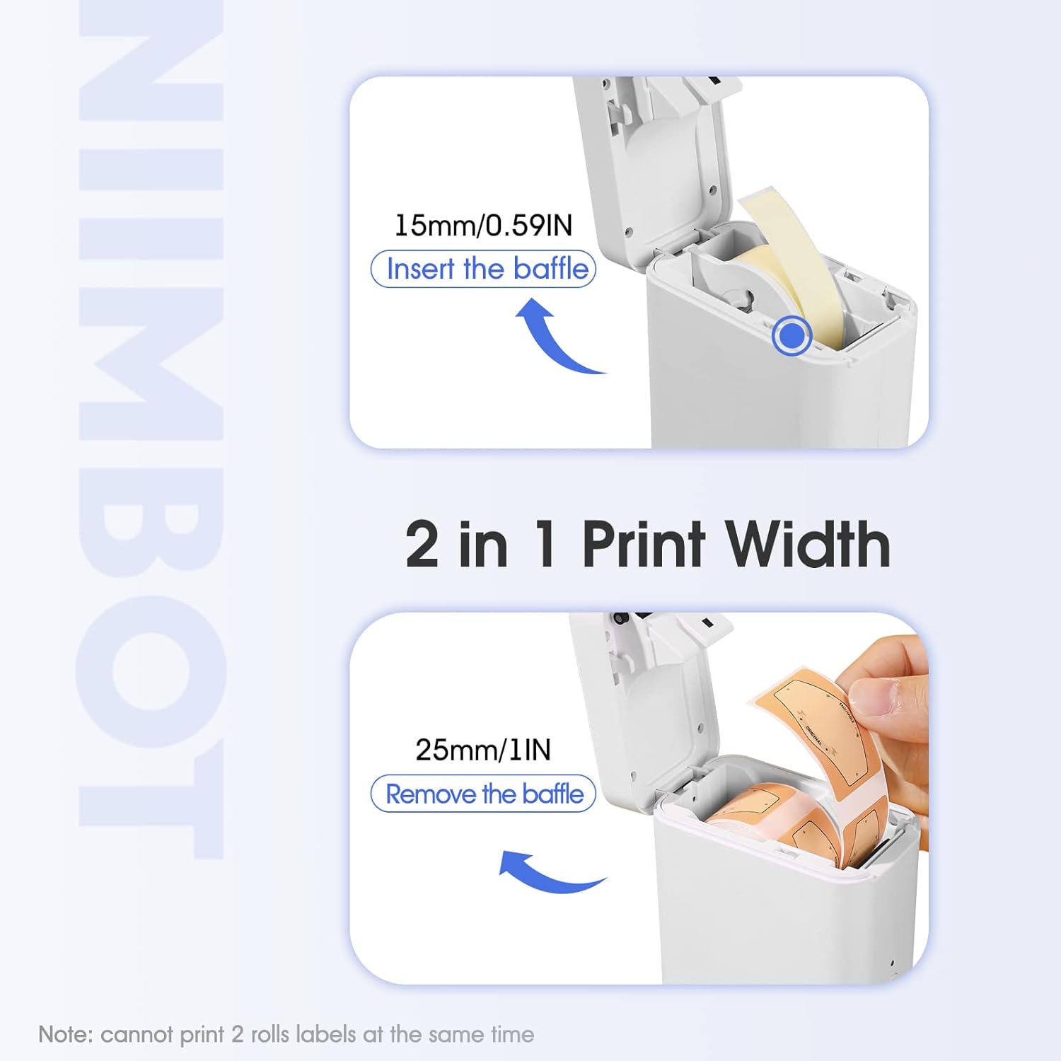 - 2 in 1 Label Printer-NIIMBOT D101 label maker machine support label 0.4''-1'' width with removable separator. You can print 0.5inch name, switch labels and cable labels with the separator, or print 1inch price tag or product labels by removing the separator. NOTE: Cannot print 2 rolls of labels concurrently!