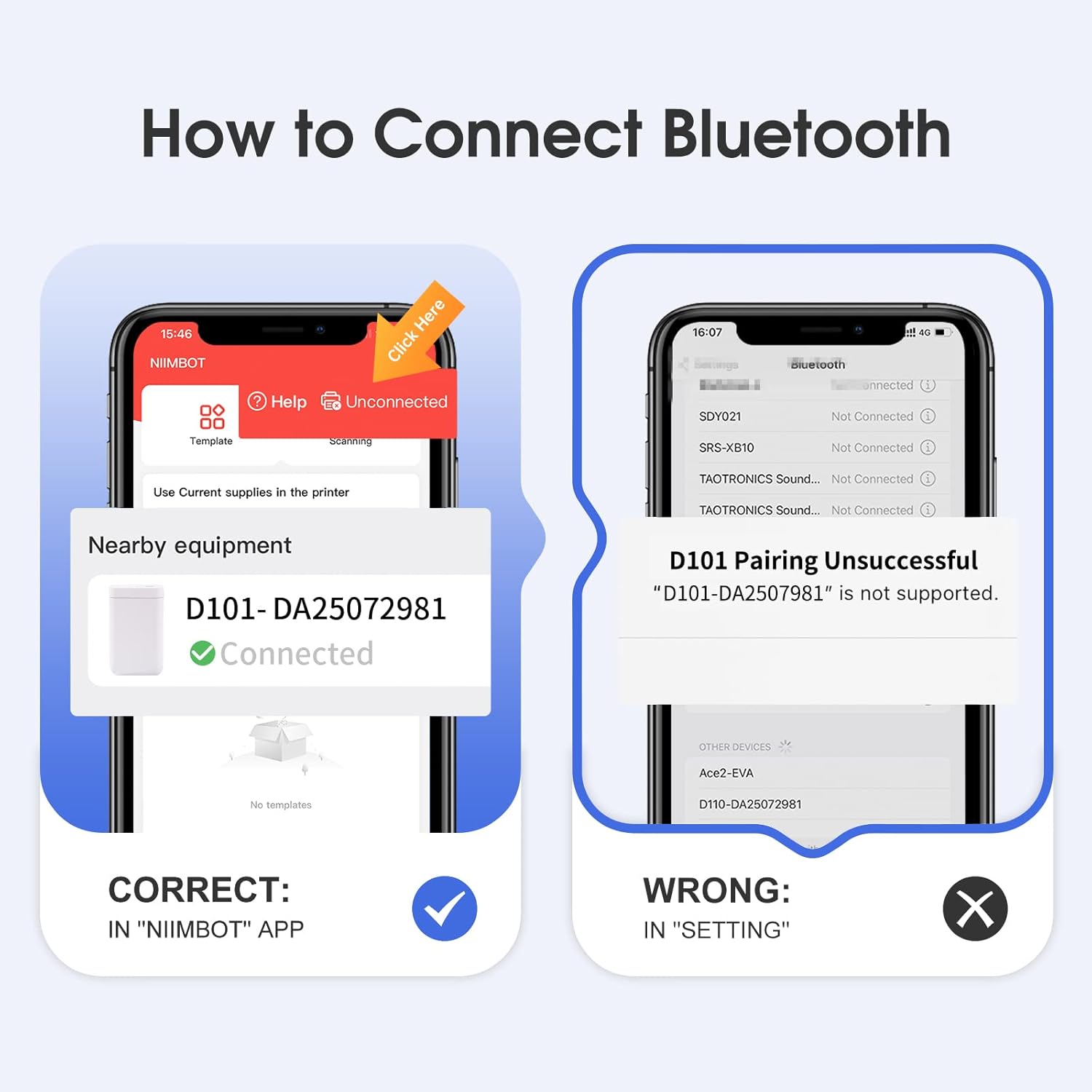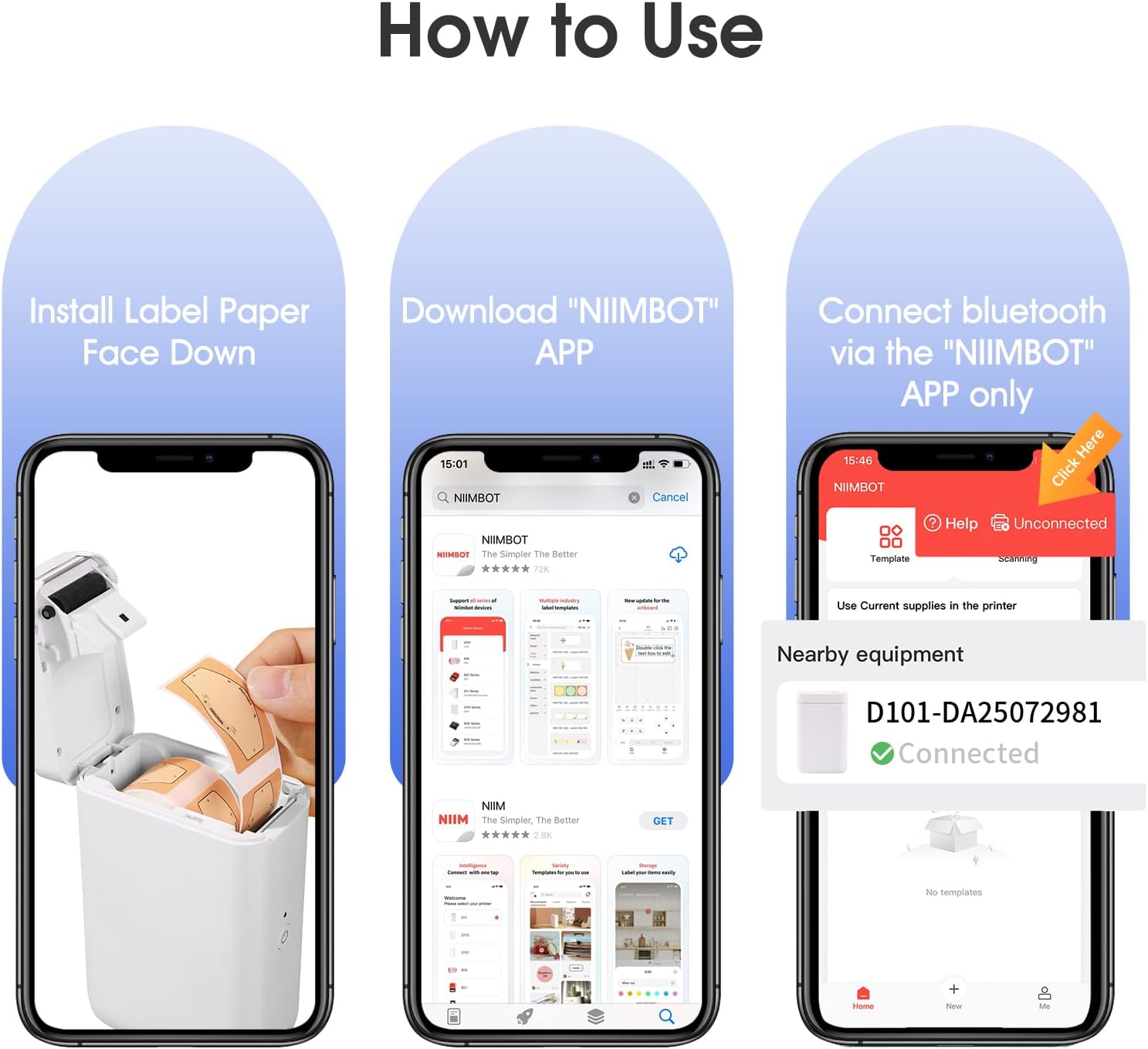 - Easy to Use-It is incompatible with iPad. Print with App: Install NIIMBOT App from APP Store & Google Play, Turn on D101 label printer and open bluetooth connection. Choosing and connecting printer model D101 from NIIMBOT APP, Then Enjoy Printing. Compatible with Android and iOS.