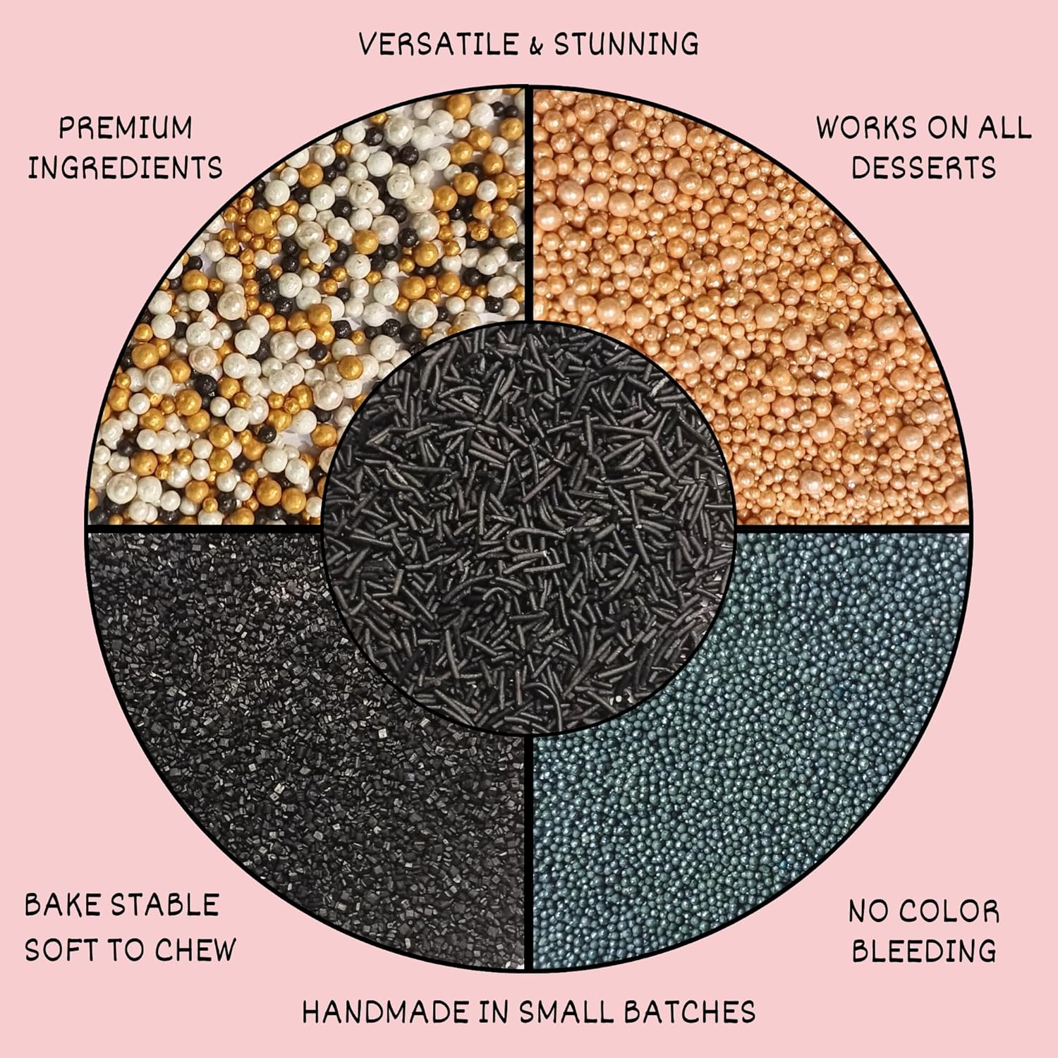 Confect Masquerade Sprinkles Mix – Champagne Gold & Black Pearl Dragees, Black Jimmies & Sparkling Sugar | Edible Sprinkles for Cakes, Cupcakes & Desserts | Vegan, Gluten-Free, Nut-Free, Soy-Free, Dairy-Free, Palm Oil-Free- 5 Oz