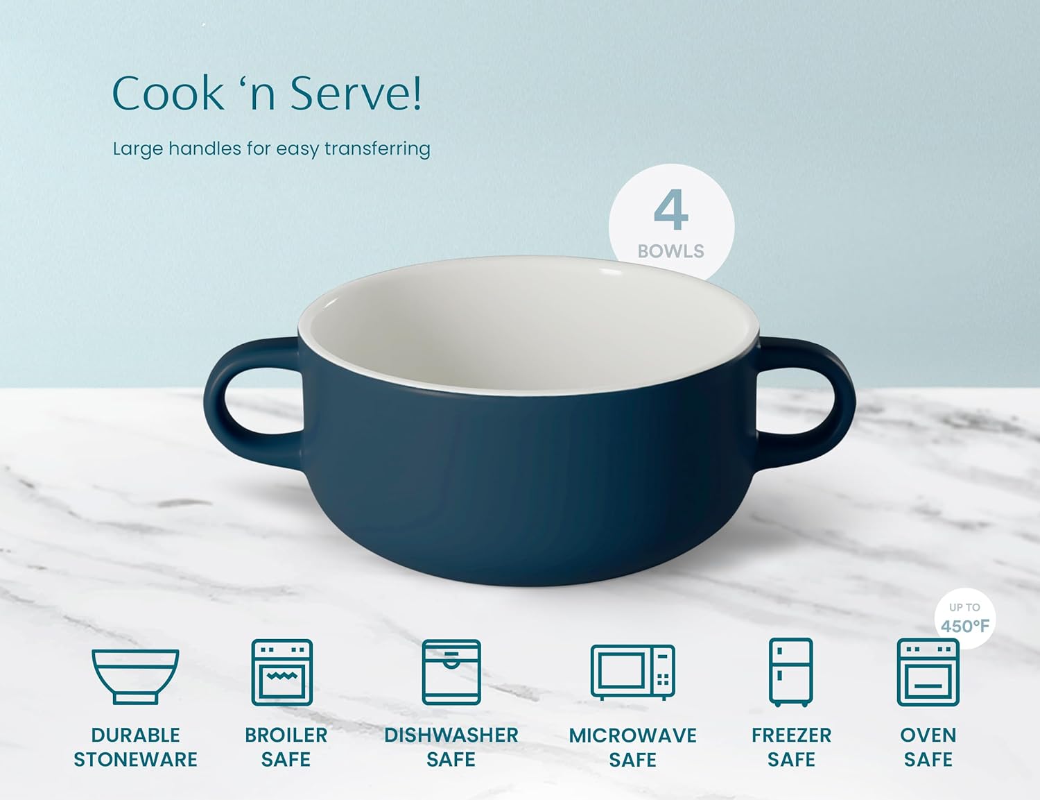 Kook Soup Crocks, Ceramic Bowls, Broil, Oven, Microwave and Dishwasher Safe, with Handles, For Casserole, Pasta, Cereal, 18 oz, Set of 4 (Navy)