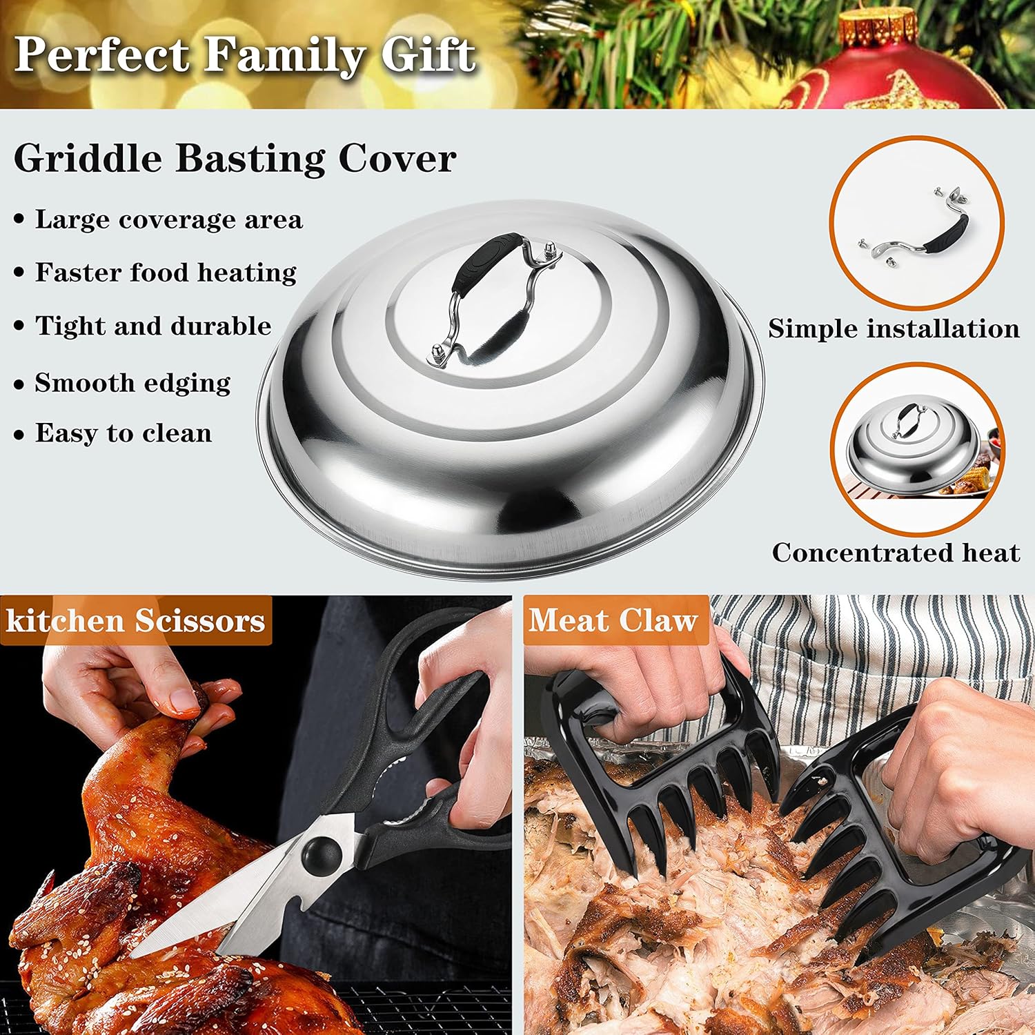 - THE MOST PRACTICAL GRIDDLE ACCESSORIES - The grill dome is ideal for concentrating heat to cook meat evenly, to melt cheese or to steam vegetables. Grill press is large enough to flattens the bacon, keeping its shape for even cooking. Shredding meat is a breeze with our meat claws. Also coming with ultra sharp&all-purpose kitchen scissors and heat-resistant silicone grill glove for most kitchen tasks.